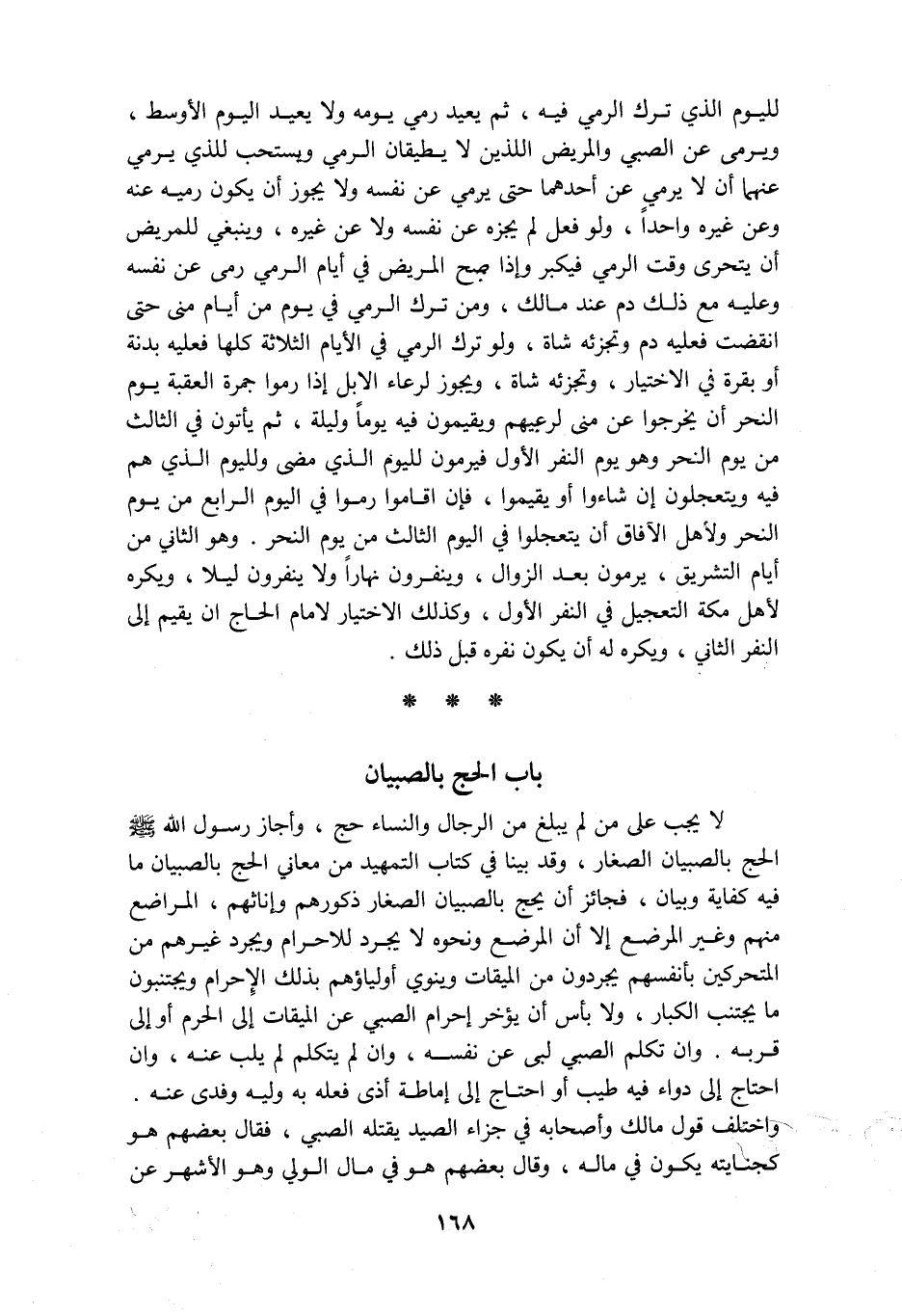 لليوم الذي ترك الرمي فيه ثم يعيد رمي يومه ولا يعيد اليوم الأوسط ويرمي عن الصبي والمريض اللذين لا يطيقان الرمي ويستحب للذي يرمي عنهما أن لا يرمي عن أحدهما حتى يرمي عن نفسه ولا يجوز أن يكون رميه عنه وعن غيره واحدا ولو فعل لم يجزه عن نفسه ولا عن غيره وينبغي للمريض أن يتحرى وقت الرمي فيكبر وإذا صح المريض في أيام الرمي رمى عن نفسه وعليه مع ذلك دم عند مالك ومن ترك الرمي في يوم من أيام منى حتى انقضت فعليه دم وتجزئه شاة ولو ترك الرمي في الأيام الثلاثة كلها فعليه بدنة أو بقرة في الاختيار وتجزئه شاة ويجوز لرعاء الإبل إذا رموا جمرة العقبة يوم النحر أن يخرجوا عن منى لرعيهم ويقيمون فيه يوما وليلة ثم يأتون في الثالث من يوم النحر وهو النفر الأول فيرمون لليوم الذي مضى ولليوم الذي هم فيه ويتعجلون إن شاءوا أو يقيموا فإن اقاموا رموا في اليوم الرابع من يوم النحر ولأهل الآفاق أن يتعجلوا في اليوم الثالث من يوم النحر وهو الثاني من أيام التشريق يرمون بعد الزوال وينفرون نهارا ولا ينفرون ليلا ويكره لأهل مكة التعجيل في النفر الأول وكذلك الاختيار لامام الحاج ان يقيم إلى النفر الثاني ويكره له أن يكون نفره قبل ذلك باب الحج بالصبيان لا يجب على من لم يبلغ من الرجال والنساء الحج وأجاز رسول الله صلى الله عليه وسلم الحج بالصبيان الصغار وقد بينا في كتاب التمهيد من معاني الحج بالصبيان ما في كفاية وبيان فجائز أن يحج بالصبيان الصغار ذكورهم وإناثهم المراضع منهم وغير المرضع إلا أن المرضع ونحوه لا يجرد للاحرام ويجرد غيرهم من المتحركين بأنفسهم يجردون من الميقات وينوي أولياؤهم بذلك الإحرام ويجتنبون ما يجتنب الكبار ولا بأس أن يؤخر إحرام الصبي عن الميقات إلى الحرم أو إلى قربه وان تكلم الصبي لبى عن نفسه وان لم يتكلم لم يلب عنه وان احتاج إلى دواء فيه طيب أو احتاج إلى إماطة أذى فعله به وليه وفدى عنه واختلف قول مالك وأصحابه في جزاء الصيد يقتله الصبي فقال بعضهم هو كجنايتة يكون في ماله وقال بعضهم هو في مال الولي وهو الأشهر عن