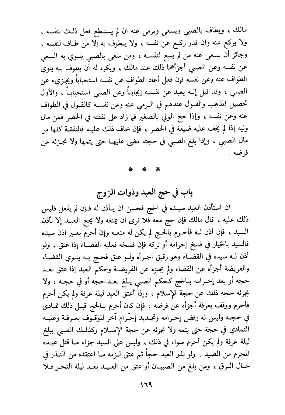 مالك ويطاف بالصبي ويسعى ويرمى عنه ان لم يستطع فعل ذلك بنفسه ولا يركع عنه وان قدر ركع عن نفسه ولا يطوف به إلا من طاف لنفسه وجائز أن يسعى عنه من لم يسع لنفسه ومن سعى بالصبي ينوي به السعي عن نفسه وعن الصبي أجزأهما ذلك عند مالك ويكره له أن يطوف به ينوي الطواف عنه وعن نفسه فإن فعل أعاد الطواف عن نفسه استحبابا ويجزئ عن الصبي وقد قيل إنه يعيد عن نفسه إيجابا وعن الصبي استحبابا والأول تحصيل المذهب والقول عندهم في الرمي عنه وعن نفسه كالقول في الطواف عنه وعن نفسه وإذا حج الولي بالصغير فما زاد على نفقته في الحضر فمن مال وليه إذا لم يخف عليه ضيعة في الحضر فإن خاف ذلك عليه فالنفقة كلها من مال الصبي وإذا بلغ الصبي في حجته مضى عليها حتى يتمها ولا تجزئه عن فرضه باب في حج العبد وذوات الزوج ان استأذن العبد سيده في الحج فحسن ان يأذن له فإن لم يفعل فليس ذلك عليه قال مالك فإن حج معه فلا نرى ان يمنعه ولا يحج العبد إلا بإذن السيد فإن أذن له فأحرم بالحج لم يكن له منعه وإن أحرم بغير اذن سيده فالسيد بالخيار في فسخ إحرامه أو تركه فإن فسخه فعليه القضاء إذا عتق ولو أذن له سيده في القضاء وهو رقيق اجزأه ولو عتق فحج به ينوي القضاء والفريضة أجزأه عن القضاء ولم يجزه عن الفريضة وحكم العبد إذا عتق بعد حجه أو بعد إحرامه بالحج كحكم الصبي يبلغ بعد حجه أو في حجه ولا يجزئه حجه ذلك عن حجة الإسلام وإذا أعتق العبد ليلة عرفة ولم يكن أحرم فأحرم ووقف بعرفة أجزأه عن فرضه فإن كان أحرم بالحج قبل ذلك تمادى في حجه وليس له رفض احرامه وتجديد احرام آخر للوقوف بعرفة وعليه التمادي في حجة حتى يتمه ولا يجزئه عن حجة الإسلام وكذلك الصبي يبلغ ليلة عرفة ولم يكن أحرم سواء في ذلك وليس على السيد جزاء ما قتل عبده المحرم من الصيد ولو نذر العبد حجا ثم عتق لزمه ما اعتقده من النذر في حال الرق ومن بلغ من الصبيان أو عتق من العبيد بعد ليلة النحر فلا