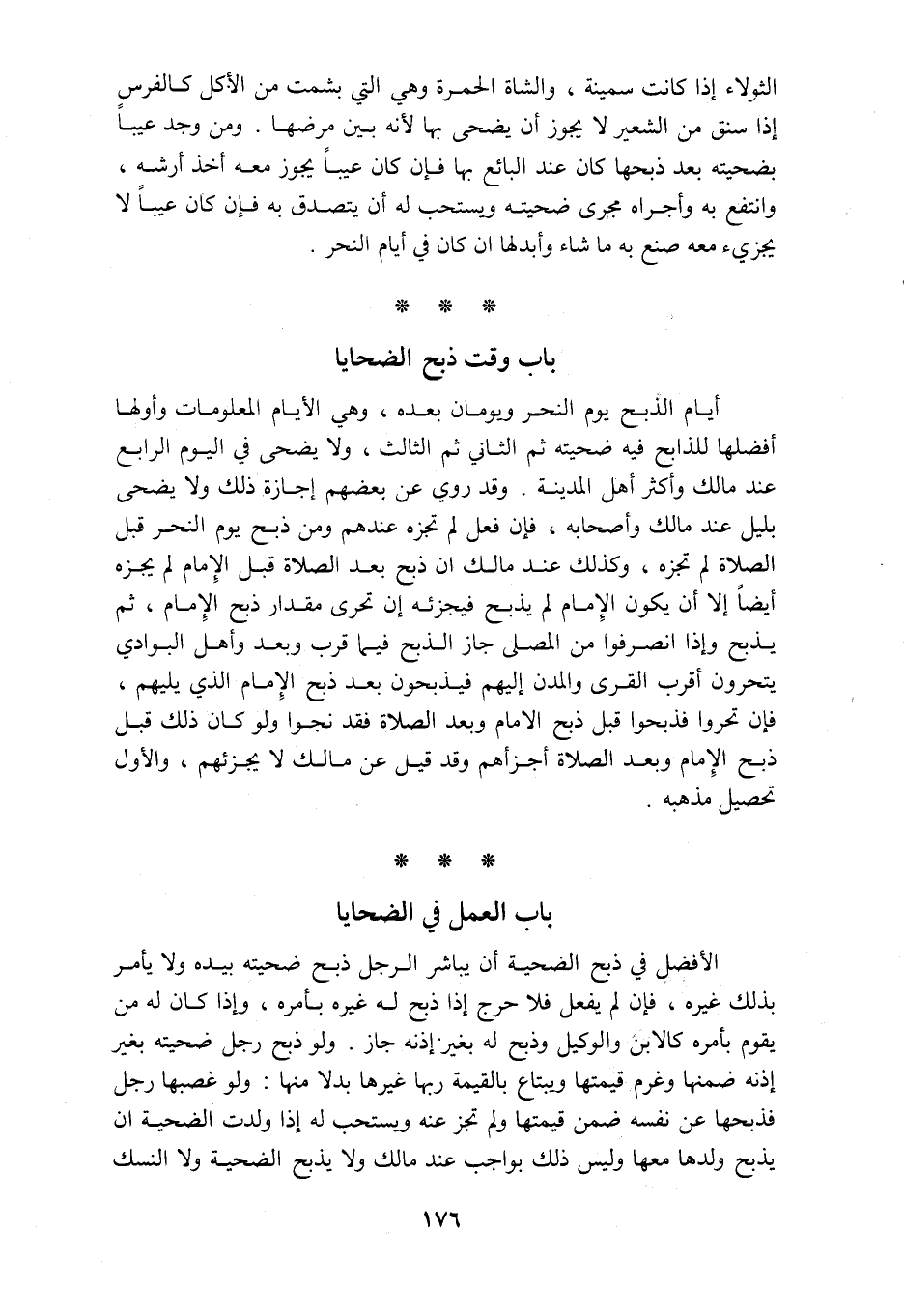 الثولاء إذا كانت سمينة والشاة الحمرة وهي التي بشمت من الأكل كالفرس إذا سنق من الشعير لا يجوز أن يصحى بها لأنه بين مرضها ومن وجد عيبا بضحيته بعد ذبحها كان عند البائع بها فإن كان عيبا يجوز معها أخذ أرشه وانتفع به وأجراه مجرى ضحيته ويستحب له أن يتصدق به فإن كان عيبا لا يجزئ معه صنع به ما شاء وأبدلها إن كان في أيام النحر باب وقت ذبح الضحايا أيام الذبح يوم النحر ويومان بعده وهي الأيام المعلومات وأولها أفضلها للذبائح فيه ضحيته ثم الثاني ثم الثالث ولا يضحى في اليوم الرابع عن مالك وأكثر أهل المدينة وقد روي عن بعضهم إجازة ذلك ولا يضحى بليل عند مالك وأصحابه فإن فعل لم تجزه عندهم ومن ذبح يوم النحر قبل الصلات لم تجزه وكذلك عند مالك إن ذبح بعد الصلاة قبل الإمام لم يجزه أيضا إلا أن يكون الإمام لم يذبح فيجزئه إن تحرى مقدرا ذبح الإمام ثم يذبح وإذا انصرفوا من المصلى جاز الذبح فيما قرب وبعد وأهل البوادي يتحرون أقرب القرى والمدن إليهم فيذبحون بعد ذبح الإمام الذي يليهم فإن تحروا فذبحوا قبل ذبح الإمام وبعد الصلاة فقد نجوا ولو كان ذلك قبل ذبح الإمام وبعد الصلاة أجزأهم وقد قيل عن مالك لا يجزئهم والأول تحصيل مذهبه باب العمل في الضحايا الأفضل في ذبح الضحية أن يباشر بالرجل ذبح ضحيته بيده ولا يأمر بذلك غيره فإن لم يفعل فلا حرج إذا ذبح له غيره بأمره وإذا كان له من يقوم بأمره كالابن والوكيل وذبح له بغير إذنه جاز ولو ذبح رجل ضحيته بغير إذنه ضمنها وغرم قيمتها ويبتاع بالقيمة ربها غيرها بدلا منها ولو غصبها رجل فذبحها عن نفسه ضمن قيمتها ولم تجز عنه ويستحب له إذا ولدت الضحية أن يذبح ولدها معها وليس ذلك بواجب عند مالك ولا يذبح الضحية ولا النسك