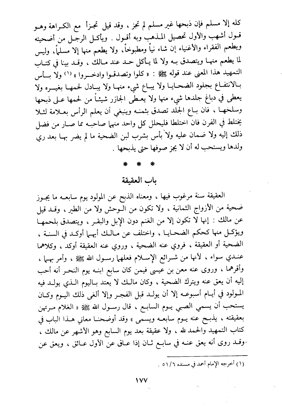 كله إلا مسلم فإن ذبحها غير مسلم لم تجز وقد قيل تجزأ مع الكراهة وهو قول أشهب والأول تحصيل المذهب وبه أقول ويأكل الرجل من أضحيته ويطعم الفقراء والأغنياء إن شاء نيا ومطبوخا ولا يطعم منها إلا مسلما وليس لما يطعم منها ويتصدق به ولا لما يأكل حد عند مالك وقد بينا في كتاب التمهيد هذا المعنى عند قوله صل الله عليه وسلم كلوا وتصدقوا وادخروا ولا بأس بالانتفاع بجلود الضحايا ولا يباع شئ منها ولا يبادل لحمها بغيره ولا يعطى في دباغ جلدها شيء منها ولا يعطى الجازر شيئا من لحمها على ذبحها وسلخها فان باع الجلد تصدق بثمنه وينبغي أن يعلم الرأس بعلامة لئلا يختلط في الفرن فان اختلطا فليحلل كل واحد منهما صاحبه مما صار من فضل ذلك إليه ولا ضمان عله ولا بأس بشرب لبن الضحية ما لم يضر بها بعد ري ولدها ويستحب له أن لا يجز صوفها حتى يذبحها باب العقيقة العقيقة سنة مرغوب فيها ومعناه الذبح عن المولود يوم سابعه ما يجوز ضحية من الأزواج الثمانية ولا تكون من الوحش ولا من الطير وقد قيل عن مالك إنها لا تكون إلا من الغنم دون الإبل والبقر ويتصدق بلحمها ويؤكل منها كحكم الضحايا واختلف عن مالك أيهما أوكد في السنة الضحية أو العقيقة فروي عنه الضحية وروي عنه العقيقة أوكد وكلاهما عندي سواء لأنها من شرائع الإسلام فعلهما رسول الله صلى الله عليه وسلم وأمر بهما وأقرهما وروى عنه معن بن عيسى فيمن كان سابع ابنه يوم النحر أنه أحب إليه أن يعق عنه ويترك الضحية وكان مالك لا يعتد باليوم الذي يولد فيه المولود في أيام أسبوعه إلا أن يولد قبل الفجر وإلا ألغى ذلك اليوم وكان يستحب أن يسمي الصبي يوم السابع قال رسول الله صلى الله عليه وسلم الغلام مرتهن بعقيقته يذبح عنه يوم سابعه ويسمى وقد أوضحنا معاني هذا الباب في كتاب التمهيد والحمد لله ولا عقيقة بعد يوم السابع وهو الأشهر عن مالك وقد روى أنه يعق عنه في سابع ثان إذا عاق عن الأول عائق ويعق عن