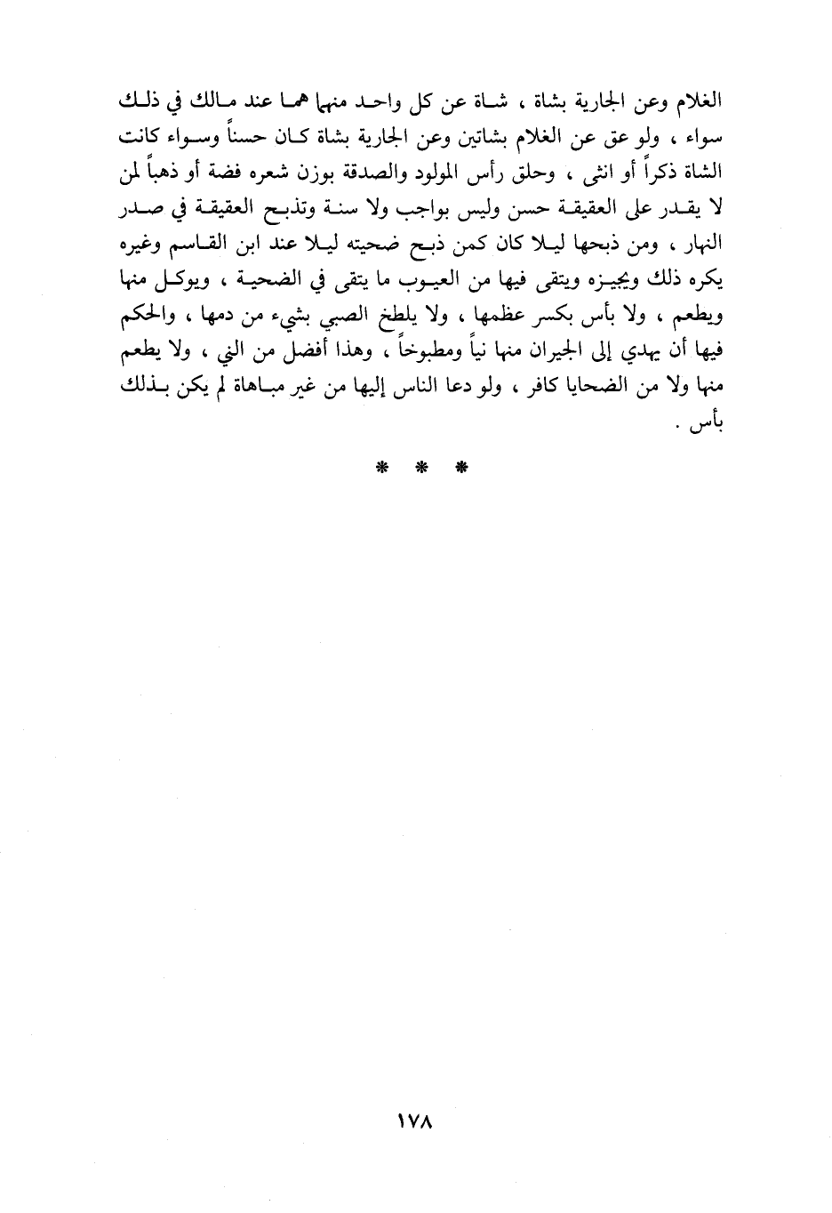 الغلام وعن الجارية بشاة شاة عن كل واحد منهما هما عند مالك في ذلك سواء ولو عق عن الغلام بشاتين وعن الجارية بشاة كان حسنا وسواء كانت الشاة ذكرا أو أنثى وحلق رأس المولود والصدقة يوزن شعره فضة أو ذهبا لمن لا يقدر على العقيقة حسن وليس يواجب ولا سنة وتذبح العقيقية في صدر النهار ومن ذبحها ليلا كان كمن ذبح ضحيتة ليلا عند ابن القاسم وغيره يكره ذلك ويجيزه ويتقى فيها من العيوب ما يتقى في الضحية ويوكل منها ويطعم ولا بأس بكسر عظمها ولا يلطخ الصبي بشئ من دمها والحكم فيها أن يهدي إلى الجيران منها نيا ومطبوخا وهذا أفضل من الني ولا يطعم منها ولا من الضحايا كافر ولو دعا الناس إليها من غير مباهاة لم يكن بذلك بأس