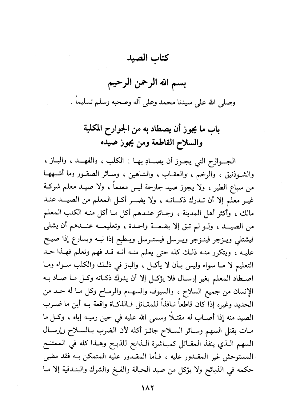 كتاب الصيد بسم الله الرحمن الرحيم وصلى الله على سيدنا محمد وعلى آله وصحبه وسلم تسليما باب ما يجوز أن يصطاد به من الجوارح المكلبة والسلاح القاطعة ومن يجوز صيده الجوارح التي يجوز أن يصاد بها الكلب والفهد والباز والشوذنيق والرخم والعقاب والشاهين وسائر الصقور ومن أشبهها من سباع الطير ولا يجوز صيد جارحة ليس معلما ولا صيد معلم شركة غير معلم إلا أن تدرك ذكاته ولا يضر أكل المعلم من الصيد عند مالك وأكثر أهل المدينة وجائز عندهم أكل ما أكل منه الكلب المعلم من الصيد ولو لم تبق إلا بضعة واحدة وتعليمه عندهم أن يشلى فيشتلي ويزجر فينزجر ويرسل فيسترسل ويطيع إذا نبه ويسارع إذا صيح عليه ويتكرر منه ذلك كله حتى يعلم منه أنه قد فهم وتعلم فهذا حد التعليم لا ماسواه وليس بأن لا يأكل والباز في ذلك والكلب سواء ومن اصطاد المعلم بغير إرسال فلا يؤكل إلا إن يدرك ذكاته وكل ما صاد به الإنسان من جميع السلاح والسيوف والسهام والرماح وكل ما له حد من الحديد وغيره إذا كان قاطعا نافذا للمقاتل فالذكاة واقعة به أين ما ضرب الصيد منه إذا أصاب له مقتلا وسمى الله عليه في حين رميه إياه وكل ما مات بقتل السهم وسائر السلاح جائز أكله لأن الضرب بالسلاح وإرسال السهم الذي ينفذ المقاتل كمباشرة الذابح للذبح وهذا كله في الممتنع المستوحش غير المقدور عليه فأما المقدور عليه المتمكن به فقد مضى حكمه في الذبائح ولا يؤكل من صيد الحبالة والفخ والشرك والبندقية إلا ما