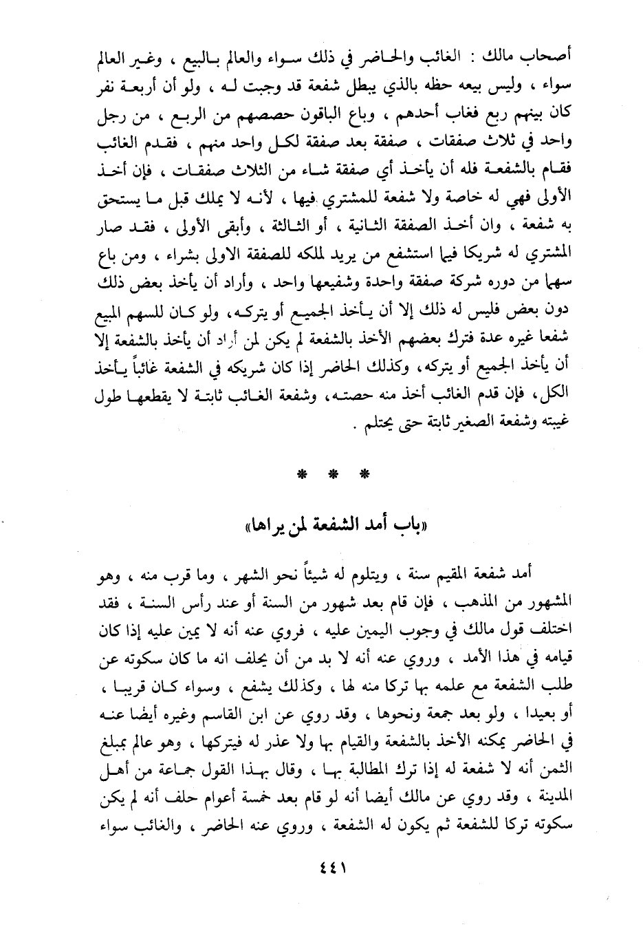 أصحاب مالك الغائب والحاضر في ذلك سواء والعالم بالبيع وغير العالم سواء وليس بيعه حظه بالذي يبطل شفعة قد وجبت له ولو أن أربعة نفر كان بينهم ربع فغاب أحدهم وباع الباقون حصصهم من الربع من رجل واحد في ثلاث صفقات صفقة بعد صفقة لكل واحد منهم فقدم الغائب فقام بالشفعة فله أن يأخذ أي صفقة شاء من الثلاث صفقات فإن أخذ الأولى فهي له خاصة ولا شفعة للمشتري فيها لأنه لا يملك قبل ما يستحق به شفعة وان أخذ الصفقة الثانية أو الثالثة وأبقى الأولى فقد صار المشتري له شريكا فيما استشفع من يريد لملكه للصفقة الأولى بشراء ومن باع سهما من دوره شركة صفقة واحدة وشفيعها واحد وأراد أن يأخذ بعض ذلك دون بعض فليس له ذلك إلا أن يأخذ الجميع أو يتركه ولو كان للسهم المبيع شفعا غيره عدة فترك بعضهم الأخذ بالشفعة لم يكن لمن أراد أن يأخذ بالشفعة إلا أن يأخذ الجميع أو يتركه وكذلك الحاضر إذا كان شريكه في الشفعة غائبا يأخذ الكل فإن قدم الغائب أخذ منه حصته وشفعة الغائب ثابتة لا يقطعها طول غيبته وشفعة الصغير ثابتة حتى يحتلم باب أمد الشفعة لمن يراها أمد شفعة المقيم سنة ويتلوم له شيئا نحو الشهر وما قرب منه وهو المشهور من المذهب فإن قام بعد شهور من السنة أو عند رأس السنة فقد اختلف قول مالك في وجوب اليمين عليه فروي عنه أنه لا يمين عليه إذا كان قيامه في هذا الأمد وروي عنه أنه لا بد من أن يحلف انه ما كان سكوته عن طلب الشفعة مع علمه بها تركا منه لها وكذلك يشفع وسواء كان قريبا أو بعيدا ولو بعد جمعة ونحوها وقد روي عن ابن القاسم وغيره أيضا عنه في الحاضر يمكنه الأخذ بالشفعة والقيام بها ولا عذر له فيتركها وهو عالم بمبلغ الثمن أنه لا شفعة له إذا ترك المطالبة بها وقال بهذا القول جماعة من أهل المدينة وقد روي عن مالك أيضا أنه لو قام بعد خمسة أعوام حلف أنه لم يكن سكوته تركا للشفعة ثم يكون له الشفعة وروي عنه الحاضر والغائب سواء