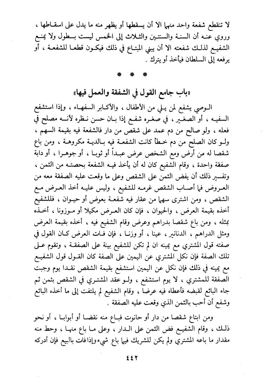 لا تنقطع شفعة واحد منهما الا أن يسقطها أو يظهر منه ما يدل على اسقاطها وروي عنه أن السنة والسنتين والثلاث إلى الخمس ليست بطول ولا يمنع الشفيع لذلك شفعته الا أن يبني المبتاع في ذلك فيكون قطعا للشفعة أو يرفعه إلى السلطان فيأخذ أو يترك باب جامع القول في الشفعة والعمل فيها الوصي يشفع لمن يلي من الأطفال والأكابر السفهاء وإذا استشفع السفيه أو الصغير في صغره شفع إذا بان حسن نظره لأنه مصلح في فعله ولو صالح من دم عمد على شقص من دار فالشفعة فيه بقيمة السهم ولو كان الصلح من دم خطأ كانت الشفعة فيه بالدية مكروهة ومن باع شقصا له من أرض ومع الشخص عرض عبدا أو ثوبا أو جوهرا أو دابة صفقة واحدة وقام الشفيع كان له أن يأخذ فيه الشفعة بحصته من الثمن وتفسير ذلك أن يفض الثمن على الشقص وعلى ما وقعت عليه الصفقة معه من العروض فما أصاب الشقص غرمه للشفيع وليس عليه أخذ العرض مع الشقص ومن اشترى سهما من عقار فيه شفعة بعوض أو حيوان فللشفيع أخذه بقيمة العرض والحيوان فإن كان العرض مكيلا أو موزونا أخذه بمثله ومن باع شقصا بدراهم وعرض وقام الشفيع فيه أخذه بقيمة العرض ومثل الدراهم الدنانير عينا أو وزنا فإن فات العرض كان القول في صفته قول المشتري مع يمينه ان لم تكن للشفيع بينه على الصفقة وتقوم على تلك الصفقة فإن نكل المشتري عن اليمين على الصفة كان القول قول الشفيع مع يمينه في ذلك فإن نكل عن اليمين استشفع بقيمة الشقص نقدا يوم وجبت الصفقة للمشتري لا يوم استشفع ولو عقد المشتري في الشقص بثمن ثم جاء البائع لقبضه فأعطاه فيه عرضا وقام الشفيع لم يلتفت إلى ما أخذه البائع وشفع أن أحب بالثمن الذي وقعت عليه الصفقة ومن ابتاع شقصا من دار أو حانوت فباع منه نقضا أو أبوابا أو نحو ذلك وقام الشفيع فض الثمن على الدار وعلى ما باع منها وحط منه مقدار ما باعه المشتري ولم يكن للشريك فيما باع شيء وإذا فات بالبيع فإن أدركه
