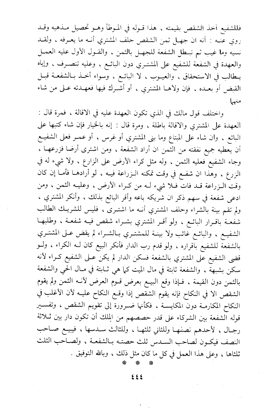 فللشفيع أخذ الشقص بقيمته هذا قوله في الموطأ وهو تحصيل مذهبه وقد روي عنه أنه ان جهل ثمن الشقص حلف المشتري أنه ما يعرفه ولقد نسيه وما غيب ثم تبطل الشفعة للجهل بالثمن والقول الاول عليه العمل والعهدة في الشفعة للشفيع على المشتري دون البائع وعليه تنصرف وإياه يطالب في الاستحقاق والعيوب لا البائع وسواء أخذ بالشفعة قبل القبض أو بعده فإن ولاها المشتري او أشرك فيها فعهدته على من شاء منها واختلف قول مالك في الذي تكون العهدة عليه في الاقالة فمرة قال العهدة على المشتري والاقالة باطلة ومرة قال إنه بالخيار فإن شاء كتبها على البائع وان شاء على المبتاع وما بنى المشتري أو غرس أو عمر فعلى الشفيع أن يعطيه جميع نفقته من الثمن أن أراد الشفعة ومن أشترى أرضا فزرعها وجاء الشفيع فعليه الثمن وله مثل كراء الارض على الزرع ولا شيء له في الزرع وهذا ان شفع في وقت تمكنه الزراعة فيه لو أرادها فأما إن كان وقت الزراعة قد فات فلا شيء له من كراء الارض وعليه الثمن ومن ادعى شفعة في سهم ذكر ان شريكه باعه وأقر البائع بذلك وأنكر المشتري ولم تقم بينة بالشراء وحلف المشتري أنه ما اشترى فليس للشريك الطالب شفعة باقرار البائع ولو أقر المشتري بشراء شقص فيه شفعة وطلبها الشفيع والبائع غائب ولا بينة للمشتري بالشراء لم يقض على المشتري بالشفعة للشفيع باقراره ولو قدم رب الدار فأنكر البيع كان له الكراء ولو قضى الشفيع على المشتري بالشفعة فسكن الدار لم يكن على الشفيع كراء لأنه سكن بشبهة والشفعة ثابتة في مال الميت كما هي ثابتة في مال الحي والشفعة بالثمن دون القيمة فإذا وقع البيع بعرض قوم العرض لأنه الثمن ولم يقوم الشقص الا في النكاح فإنه يقوم الشقص إذا وقع النكاح عليه لأن الاغلب في النكاح المكارمة دون المكايسة فكأنها ضرورة الى تقويم الشقص وتفسير قوله الشفعة بين الشركاء على قدر حصصهم من الملك أن تكون دار بين ثلاثة رجال لاحدهم نصفها وللثاني ثلثها وللثالث سدسها فيبيع صاحب النصف فيكون لصاحب السدس ثلث حصته بالشفعة ولصاحب الثلث ثلثاها وعلى هذا العمل في كل ما كان مثل ذلك وبالله التوفيق