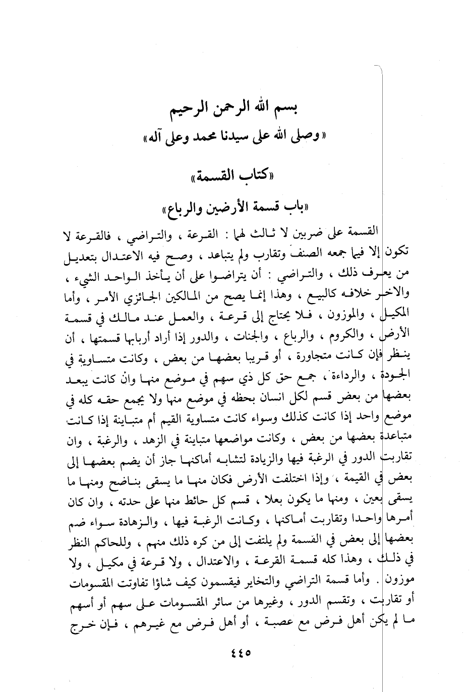 بسم الله الرحمن الرحيم وصلى الله على سيدنا محمد وعلى آله كتاب القسمة باب قسمة الارضين والرباع القسمة على ضربين لا ثالث لهما القرعة والتراضي فالقرعة لا تكون إلا فيما جمعه الصنف وتقارب ولم يتباعد وصح فيه الاعتدال بتعديل من يعرف ذلك والتراضي أن يتراضوا على أن يأخذ الواحد الشيء والآخر خلافه كالبيع وهذا إنما يصح من المالكين الجائزي الأمر وأما المكيل والموزون فلا يحتاج الى قرعة والعمل عند مالك في قسمة الارض والكروم والرباع والجنات والدور إذا أراد أربابها قسمتها أن ينظر فإن كانت متجاورة أو قريبا بعضها من بعض وكانت متساوية في الجودة والرداءة جمع حق كل ذي سهم في موضع منها وأن كانت يبعد بعضها من بعض قسم لكل انسان بحظه في موضع منها ولا يجمع حقه كله في موضع واحد إذا كانت كذلك وسواء كانت متساوية القيم أم متباينة إذا كانت متباعدة بعضها من بعض وكانت مواضعها متباينة في الزهد والرغبة وان تقاربت الدور في الرغبة فيها والزيادة لتشابه أماكنها جاز أن يضم بعضها الى بعض في القيمة واذا اختلفت الارض فكان منها ما يسقى بناضح ومنها ما يسقى بعين ومنها ما يكون بعلا قسم كل حائط منها على حدته وان كان أمرها واحدا وتقاربت أماكنها وكانت الرغبة فيها والزهادة سواء ضم بعضها الى بعض في القسمة ولم يلتفت الى من كره ذلك منهم وللحاكم النظر في ذلك وهذا كله قسمة القرعة والاعتدال ولا قرعة في مكيل ولا موزون واما قسمة التراضي والتخاير فيقسمون كيف شاؤا تفاوتت المقسومات أو تقاربت وتقسم الدور وغيرها من سائر المقسومات على سهم أو أسهم ما لم يكن أهل فرض مع عصبة او أهل فرض مع غيرهم فإن خرج