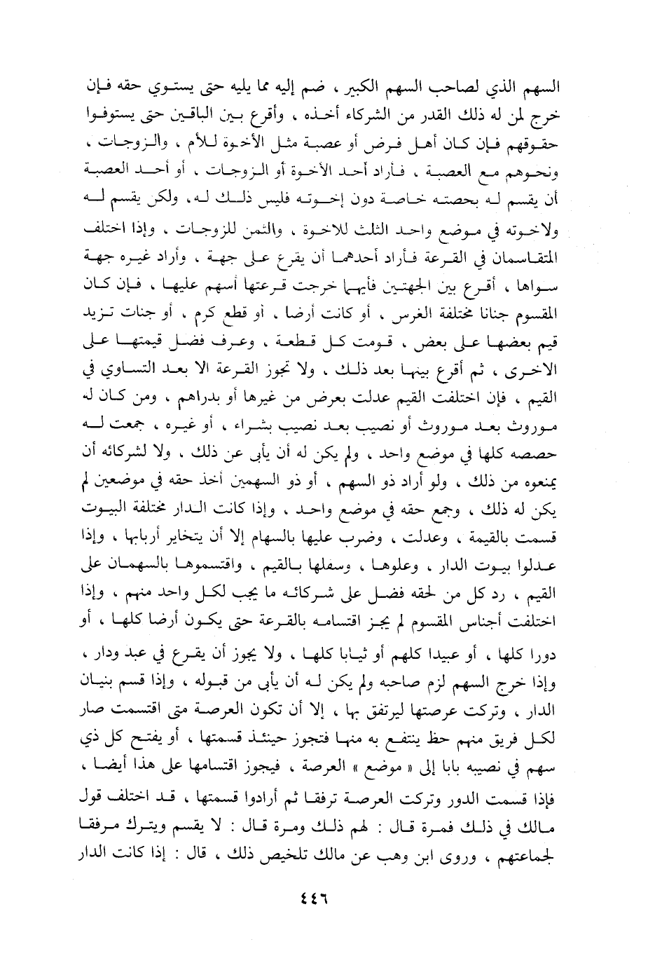 السهم الذي لصاحب السهم الكبير ضم اليه مما يليه حتى يستوي حقه فإن خرج لمن له ذلك القدر من الشركاء أخذه وأقرع بين الباقين حتى يستوفوا حقوقهم فإن كان أهل فرض أو عصبة مثل الأخوة للأم والزوجات ونحوهم مع العصبية فأراد أحد الأخوة أو الزوجات أو أحد العصبة أن يقسم له بحصته خاصة دون إخوته فليس ذلك له ولكن يقسم له وخوته ولإخوته في موضع واحد الثلث للإخوة والثمن للزوجات واذا اختلف المتقاسمان في القرعة فأراد أحدهما أن يقرع على جهة وأراد غيره جهة سواها أقرع بين الجهتين فأيهما خرجت قرعتها أسهم عليها فإن كان المقسوم جنانا مختلفة الغرس أو كانت أرضا أو قطع كرم أو جنات تزيد قيم بعضها على بعض قومت كل قطعة وعرف فضل قيمتها على الاخرى ثم أقرع بينها بعد ذلك ولا تجوز القرعة الا بعد التساوي في القيم فإن اختلفت القيم عدلت بعرض من غيرها أو بدراهم ومن كان له موروث بعد موروث أو نصيب بعد نصيب شراء أو غيره جمعت له حصصه كلها في موضع واحد ولم يكن له ان يأبى عن ذلك ولا لشركائه أن يمنعوه من ذلك ولو أراد ذو السهم أو ذو السهمين أخذ حقه في موضعين لم يكن له ذلك وجمع حقه في موضع واحد وإذا كانت الدار مختلفة البيوت قسمت بالقيمة وعدلت وضرب عليها بالسهام إلا أن يتخاير أربابها واذا عدلوا بيوت الدار وعلوها وسفلها بالقيم واقتسموها بالسهمان على القيم رد كل من لحقه فضل على شركائه ما يجب لكل واحد منهم وإذا اختلفت اجناس المقسوم لم يجز اقتسامه بالقرعة حتى يكون أرضا كلها أو دورا كلها أو عبيدا كلهم أو ثيابا كلها ولا يجوز أن يقرع في عبد ودار واذا خرج السهم لزم صاحبه ولم يكن له ان يأبى من قبوله واذا قسم بنيان الدار وتركت عرصتها ليرتفق بها إلا أن تكون العرصة متى اقتسمت صار لكل فريق منهم حظ ينتفع به منها فتجوز حينئذ قسمتها أو يفتح كل ذي سهم في نصيبه بابا الى موضع العرصة فيجوز اقتسامها على هذا ايضا فإذا قسمت الدور وتركت العرصة ترفقا ثم أرادوا قسمتها قد اختلفت قول مالك في ذلك فمرة قال لهم ذلك ومرة قال لا يقسم ويترك مرفقا لجماعتهم وروى ابن وهب عن مالك تلخيص ذلك قال إذا كانت الدار