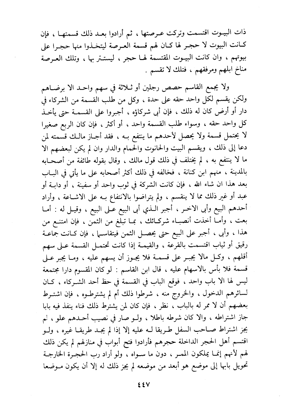 ذات البيوت اقتسمت وتركت عرصتها ثم ارادوا بعد ذلك قسمتها فإن كانت البيوت لا حجر لها كان لهم قسمة العرصة ليتخذوا منها حجرا على بيوتهم وان كانت البيوت المقتسمة لها حجر ليستر بها وتلك العرصة مناخ ابلهم ومرفقهم فتلك لا تقسم ولا يجمع القاسم حصص رجلين أو ثلاثة في سهم واحد الا برضاهم ولكن يقسم لكل واحد حقه على حدة وكل من طلب القسمة من الشركاء في دار أو أرض كان له ذلك فإن أبى شركاؤه اجبروا على القسمه حتى يأخذ كل واحد حقه وسواء طلب القسمة واحد أو أكثر فإن كان الربع صغيرا لا يحتمل قسمه ولا يحصل لاحدهم ما ينتفع به فقد أجاز مالك قسمته لمن دعا الى ذلك ويقسم البيت والحانوت والحمام والدار وان لم يكن لبعضهم الا ما لا ينتفع به لم يختلف في ذلك قول مالك وقال بقوله طائفة من أصحابه بالمدينة منهم ابن كنانة فخالفه في ذلك أكثر أصحابه على ما يأتي في الباب بعد هذا ان شاء الله فإن كانت الشركة في ثوب واحد او سفينة او دابة أو عبد أو غير ذلك مما لا ينقسم ولم يتراضوا بالانتفاع به على الاشاعة وأراد احدهم البيع وأبى الآخر أجبر الذي ابى البيع على البيع وقيل له أما بعت وأما أخذت انصباء شركائك بما تبلغ من الثمن فإن امتنع من هذا وأبى اجبر على البيع حتى يحصل الثمن فيتقاسما فإن كانت جماعة رقيق أو ثياب اقتسمت بالقرعة والقيمة اذا كانت تحتمل القسمة على سهم اقلهم وكل مالا يجبر على قسمة فلا يجوز أن يسهم عليه وما يجبر على قسمة فلا بأس بالاسهام عليه قال ابن القاسم لو كان المقسوم دار مجتمعة ليس لها الا باب واحد فوقع الباب في القسمة في حظ أحد الشركاء كان لسائرهم الدخول والخروج منه شرطوا ذلك أم لم يشترطوه فإن اشترط بعضهم أن لا ممر له بالباب نظر فإن كان لمن يشترط ذلك فناء ينفذ فيه بابا جاز اشتراطه وإلا كان شرطه باطلا ولو صار في نصيب احدهم علو لم يجز اشتراط صاحب السفل طريقا له عليه إلا اذا لم يجد طريقا غيره ولو اقتسم أهل الحجر الداخلة فأرادوا فتح ابواب في منازلهم لم يكن لك لهم لأنهم إنما يملكون الممر دون ما سواه ولو أراد رب الحجرة الخارجة تحويل بابها الى موضع هو ابعد لم يجز ذلك له إلا أن يكون موضعا