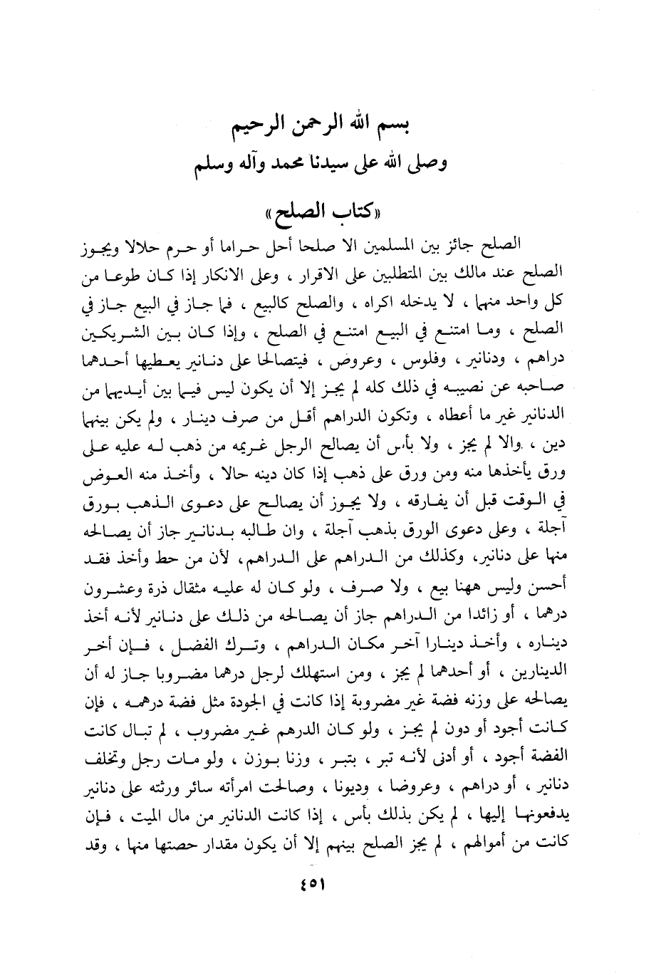 بسم الله الرحمن الرحيم وصلى الله على سيدنا محمد وآله وسلم كتاب الصلح الصلح جائز بين المسلمين الا صلحا احل حراما او حرم حلالا ويجوز الصلح عند مالك بين المتطلبين على الاقرار وعلى الانكار إذا كان طوعا من كل واحد منهما لا يدخله اكراه والصلح كالبيع فما جاز في البيع جاز في الصلح وما امتنع في البيع امتنع في الصلح واذا كان بين الشريكين دراهم ودنانير وفلوس وعروض فيتصالحا على دنانير يعطيها احدهما صاحبه عن نصيبه في ذلك كله لم يجز الا ان يكون ليس فيما بين أيديهما من الدنانير غير ما أعطاه وتكون الدراهم أقل من صرف دينار ولم يكن بينهما دين والا لم يجز ولا بأس أن يصالح الرجل غريمه من ذهب له عليه على ورق يأخذها منه ومن ورق على ذهب اذا كان دينه حالا وأخذ منه العوض في الوقت قبل أن يفارقه ولا يجوز أن يصالح على دعوى الذهب بورق آجلة وعلى دعوى الورق بذهب آجلة وان طالبه بدنانير جاز ان يصالحه منها على دنانير وكذلك من الدراهم على الدراهم لأن من حط وأخذ فقد أحسن وليس ههنا بيع ولا صرف ولو كان عليه مثقال ذرة وعشرون درهما أو زائدا من الدراهم جاز أن يصالحه من ذلك على دنانير لانه أخذ ديناره وأخذ دينارا آخر مكان الدراهم وترك الفضل فإن أخر الدينارين أو احدهما لم يجز ومن استهلك لرجل درهما مضروبا جاز له أن يصالحه على وزنه فضة غير مضروبة اذا كانت في الجودة مثل فضة درهمه فإن كانت أجود أو دون لم يجز ولو كان الدرهم غير مضروب لم تبال كانت الفضة اجود او ادنى لانه تبر بتبر وزنا بوزن ولو مات رجل وتخلف دنانير او دراهم وعروضا وديونا وصالحت امرأته سائر ورثته على دنانير يدفعونها اليها لم يكن بذلك بأس اذا كانت الدنانير من مال الميت فإن كانت أموالهم لم يجز الصلح بينهم إلا ان يكون مقدار حصتها منها وقد