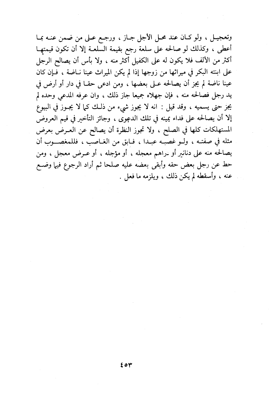 وتعجيل ولو كان محل الاجل جاز ورجع على من ضمن عنه بما أعطى وكذلك لو صالحه على سلعة رجع بقيمة السلعة الا ان تكون قيمتها أكثر من الالف فلا يكون له على كفيل اكثر منه ولا بأس ان يصالح الرجل على ابنته البكر في ميراثها من زوجها اذا لم يكن الميراث عينا ناضة فإن كان عينا ناضة لم يجز أن يصالحه على بعضها ومن ادعى حقا في دار أو أرض في يد رجل فصالحه منه فإن جهلاه جميعا جاز ذلك وان عرفه المدعي وحده لم يجز حتى يسميه وقد قيل انه لا يجوز شيء من ذلك كما لا يجوز في البيوع الا ان يصالحه على فداء يمينه في تلك الدعوى وجائز التأخير في قيم العروض المستهلكات كلها في الصلح ولا تجوز النظرة ان يصالح عن العروض بعرض مثله في صفته ولو غصبه عبدا فأبق من الغاضب فللمغضوب ان يصالحه منه على دنانير او دراهم معجلة او مؤجلة أو عرض معجل ومن حط عن رجل بعض حقه وأبقى بعضه عليه صلحا ثم اراد الرجوع فيما وضع عنه وأسقطه لم يكن ذلك ويلزمه ما فعل