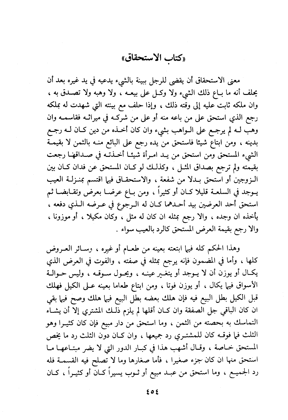 كتاب الاستحقاق معنى الاستحقاق أن يقضي للرجل ببينة بالشيء يدعيه في يد غيره بعد ان يحلف انه ما باع الشيء ولا وكل على بيعه ولا وهبه ولا تصدق به وان ملكه ثابت عليه الى وقته ذلك واذا حلف مع بينته التي شهدت له بملكه رجع الذي استحق على من باعه منه او على من شركه في ميراثه فقاسمه وان وهب له لم يرجع على الواهب بشيء وان كان اخذه من دين كان له رجع بدينه ومن ابتاع شيئا فاستحق من يده رجع على البائع منه بالثمن لا بقيمه الشيء المستحق ومن استحق من يد امرأة شيئا اخذته في صداقها رجعت بقيمته ولم ترجع بصداق المثل وكذلك لو كان المستحق عن فدان كان بين الزوجين أو استحق بدلا من شفعة والاستحقاق فيما اقتسم بمنزلة العيب يوجد في السلعة قليلا كان او كثيرا ومن باع عرضا بعرض وتقابضا ثم استحق احد العرضين بيد احدهما كان له الرجوع في عرضه الذي دفعه يأخذه ان وجده وإلا رجع بمثله ان كان له مثل وكان مكيلا او موزونا والا رجع بقيمة العرض المستحق كالرد بالعيب سواء وهذا الحكم كله فيما ابتعته بعينه من طعام أو غيره وسائر العروض كلها وأما في المضمون فإنه يرجع بمثله في صفته والفوت في العرض الذي يكال أو يوزن أن لا يوجد أو يتغير عينه ويحول سوقه وليس حوالة الاسواق فيما يكال او يوزن فوتا ومن ابتاع طعاما بعينه على الكيل فهلك قبل الكيل بطل البيع فيه فإن هلك بعضه بطل البيع فيما هلك وصح فيما بقي ان كان الباقي جل الصفقة وان كان اقلها لم يلزم ذلك المشتري الا ان يشاء التماسك به بحصته من الثمن وما استحق من دار مبيع فإن كان كثيرا وهو الثلث فما فوقه كان للمشتري رد جميعا وان كان دون الثلث رد ما يخص المستحق خاصة وقال اشهب هذا في كبار الدور التي لايضر مبتاعها ما استحق منها ان كان جزء صغيرا فأما صغارها وما لاتصلح فيه القسمة فله رد الجميع وما استحق من عبد مبيع او ثوب يسيرا كان او كثيرا كان