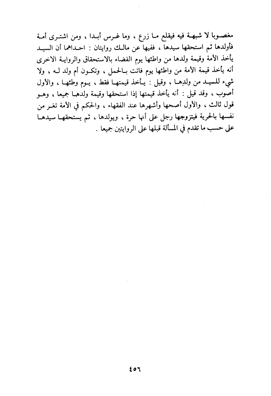 مغصوبا لا شبهة فيه فيقلع ما زرع وما غرس أبدا ومن اشترى أمة فأولدها ثم استحقها سيدها ففيها عن مالك روايتان احداهما ان السيد يأخذ الأمة وقيمة ولدها من واطئها يوم القضاء بالاستحقاق والرواية الاخرى أنه يأخذ قيمة من واطئها يوم فاتت بالحمل وتكون ام ولد له ولا شيء للسيد من ولدها وقيل يأخذ قيمتها فقط يوم وطئها والاول اصوب وقد قيل انه يأخذ قيمتها اذا استحقها وقيمة ولدها جميعا وهو قول ثالث والاول اصحها واشهرها عند الفقهاء والحكم في الأمة تغر من نفسها بالحرية فيتزوجها رجل على انها حرة ويولدها ثم يستحقها سيدها على حسب ما تقدم في المسألة قبلها على الروايتين جميعا