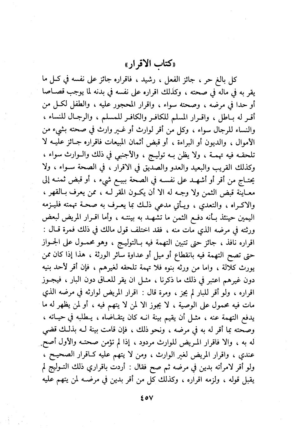 كتاب الاقرار كل بالغ حر جائز الفعل رشيد فاقراره جائز على نفسه في كل ما يقر به في ماله في صحته وكذلك اقراره على نفسه في بدنه لما يوجب قصاصا أو حدا في مرضه وصحته سواء واقرار المحجور عليه والطفل لكل من أقر له باطل واقرار المسلم للكافر والكافر للمسلم والرجال للنساء والنساء للرجال سواء وكل من اقر لوارث او غير وارث في صحته بشيء من الاموال والديون أو البراءة أو قبض أثمان المبيعات فاقراره جائز عليه لا تلحقه فيه تهمة ولا يظن به توليج والاجنبي في ذلك والوارث سواء وكذلك القريب والبعيد والعدو والصديق في الاقرار في الصحة سواء ولا يحتاج من أقر او أشهد على نفسه في الصحة ببيع شيء او قبض ثمنه الى معاينة قبض الثمن ولا وجه له الا ان يكون المقر له ممن يعرف بالقهر والاكراه والتعدي ويأتي مدعي ذلك بما يعرف به صحة تهمته فليزمه اليمين حينئذ بأنه دفع الثمن ما تشهد به بينته واما اقرار المريض لبعض ورثته في مرضه الذي مات منه فقد اختلف قول مالك في ذلك فمرة قال اقراره نافذ جائز حتى تتبين التهمة فيه بالتوليج وهو محمول على الجواز حتى تصح التهمة فيه بانقطاع او ميل او عداوة سائر الورثة هذا اذا كان ممن يورث كلالة واما من ورثه بنوه فلا تهمة تلحقه لغيرهم فإن أقر لاحد بنيه دون غيرهم اعتبر في ذلك ما ذكرنا مثل ان يقر للعاق دون البار فيجوز اقراره ولو أقر للبار لم يجز ومرة قال اقرار المريض لوارثه في مرضه الذي مات فيه محمول على الوصية لا يجوز الا لمن لا يتهم فيه او لمن يظهر له ما يدفع التهمة عنه مثل ان يقيم بينة انه كان يتقاضاه يطلبه في حياته وصحته بما اقر له به في مرضه ونحو ذلك فإن قامت بينة له بذلك قضي له به والا فاقرار المريض للوارث مردود اذا لم تؤمن صحته والاول أصح عندي واقرار المريض لغير الوارث ومن لا يتهم عليه كاقرار الصحيح ولو اقر لامرأته بدين في مرضه ثم صح فقال اردت باقراري ذلك التوليج لم يقبل قوله ولزمه اقراره وكذلك كل من أقر بدين في مرضه لمن يتهم عليه