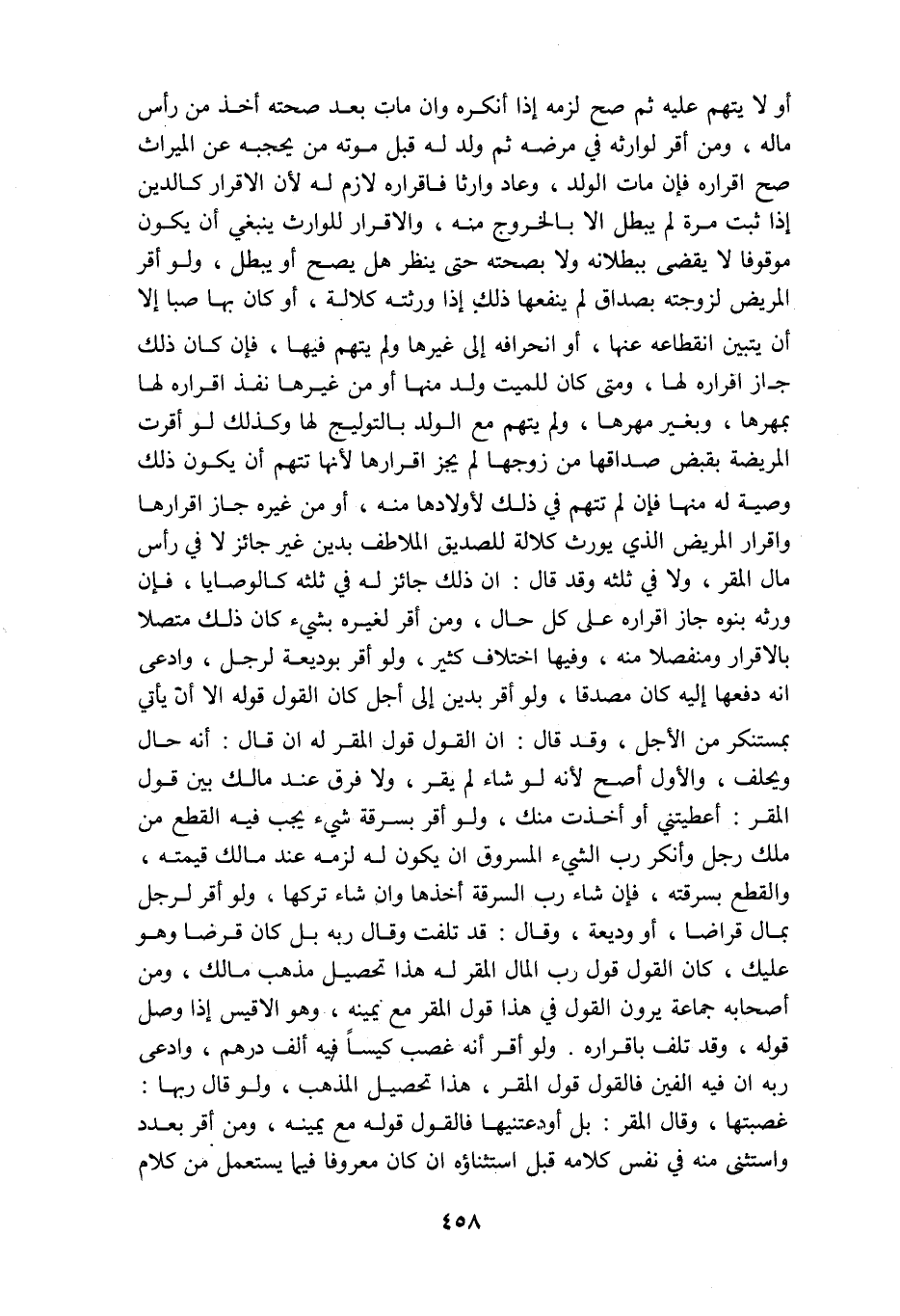 أو لا يتهم عليه ثم صح لزمه إذا أنكره وإن مات بعد صحته أخذ من رأس ماله ومن أقر لوارثه في مرضه ثم ولد له قبل موته من يحجبه عن الميراث صح إقراره فإن مات الولد وعاد وارثا فإقراره لازم له لأن الإقرار كالدين إذا ثبت مرة لم يبطل إلا بالخروج منه والإقرار للوارث ينبغي أن يكون موقوفا لا يقضي ببطلانه ولا بصحته حتى ينظر هل يصح أو يبطل ولو أقر المريض لزوجته بصداق لم ينفعها ذلك إذا ورثتهكلالة أو كان بها صبا إلا أن يتبين انقطاعه عنها أو انحرافه إلى غيرها ولم يتهم فيها فإن كان ذلك جاز إقراره لها ومتى كان للميت ولد منها أو من غيرها نفذ إقراره لها بمهرها وبغير مهرها ولم يتهم مع الولد باتوليج لها وكذلك لو أقرت المريضة بقبض صداقها من زوجها لم يجز إقرارها لأنها تتهم أن يكون ذلك وصية له منها فإن لم تتهم في ذلك لأولادها منه أو من غيره جاز إقرارها وإقرار المريض الذي يورث كلالة للصديق الملاطف بدين غير جائز لا في رأس مال المقر ولا في ثلثه وقد قال إن ذلك جائز له في ثلثه كالوصايا فإن ورثه بنوه جاز إقراره على كل حال ومن أقر لغيره بشيء كان ذلك متصلا بالإقرار ومنفصلا عنه وفيها اختلاف كثير ولو أقر بوديعة لرجل وادعى أنه دفعها إليه كان مصدقا ولو أقر بدين إلى أجل كان القول قوله إلا أن يأتي بمستنكر من الأجل وقد قال إن القول قول المقر له أن قال أنه حال ويحلف والأول أصح لأنه لو شاء لم يقر ولا فرق عند مالك بين قول المقر أعطيتني أو أخذت منك ولو أقر بسرقة شيء يجب فيه القطع من ملك رجل وأننكر رب الشيء المسروق أن يكون له لزمه عند مالك قيمته والقطع بسرقته فإن شاء رب السرقة أخذها وإن شاء تركها ولو أقر لرجل بمال قراضا أو وديعة وقال قد تلفت وقال ربه بل كان قرضا وهو عليك كان القول قول رب المال المقر له هذا تحصيل مذهب مالك ومن أصحابه جماعة يرون القول في هذا قول المقر مع يمينه وهو الأقيس إذا وصل قوله وقد تلف بإقراره ولو أقر أنه غصب كيسا فيه ألف درهم وادعى ربه أن فيه ألفين فالقول قول المقر هذا تحصيل المذهب ولو قال ربها غصبتها وقال المقر بل أودعتنيها فالقول قوله مع يمينه ومن أقر بعدد واستثنى منه في نفس كلامه قبل استثناؤه إن كان معروفا فيما يستعمل من كلام