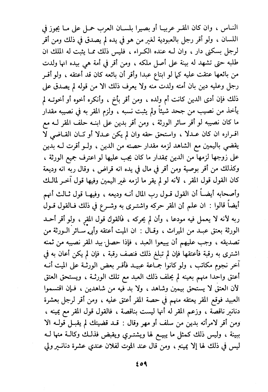الناس وإن كان المقر عربيا أو بصيرا بلسان العربحمل على ما يجوز في اللسان ولو أقر رجل بالعبودية لغير من هو في يده لم يصدق في ذلك ومن أقر لرجل بسكنى دار وأن له عنده الكراء فليس ذلك مما يثبت له الملك إن طلبه حتى تشهد له بينة على أصل مكله ومن أقر في أمة هي بيده أنها ولدت من بائعها عتقت عليه كما لو ابتاع عبدا وأقر أن بائعه كان قد أعتقه ولو أقر رجل وعليه دين بأن أمته ولدت منه ولا يعرف ذلك إلا من قوله لم يصدق على ذلك فإن أدى الدين كانت أم ولده ومن أقر بأخ وأنكره أخوه أو أخوته لم يأخذ من نصيب من جحد شيئا ولم يثبت نسبه ولزم المقر به في نصيبه مقدار ما كان نصيبه لو أقر سائر الورثة ومن أقر بدين على ابنه حلف المقر له مع إقراره إن كان عدلا واستحق حقه وإن لم كين عدلا أو كانالقاضي لا يقضي باليمين مع الشاهد لزمه مقدار حصته من الدين ولو أقرت له بدين على زوجها لزمها من الدين بمقدار ما كان يجب عليها لو اعترف جميع الورثة وكذلك من أقر بوصية ومن أقر في مال في يده أنه قراض وقال ربه أنه وديعة كان القول قول المقر لأنه لو لم يقر ما لزمه غير اليمين وفيها قول آخر لمالك وأصحابه أيضا أن القول قول رب المال أنه وديعة وفيها قول ثالث أنهم أيضا قالوا إن علم أن المقر حركه واشترى به وشرع في ذلك فالقول قول ربه لأنه لا يعمل فيه مودعا وأن لم يحركه فالقول قول المقر ولو أقر أحد الورثة بعتق عبد من الميراث وقال إن الميت أعتقه وأبى سائر الورثة من تصديقه وجب عليهم أن يبيعوا العبد فإذا حصل بيد المقر نصيبه من ثمنه اشترى به رقبة فأعتقها فإن لم تبلغ ذلك فنصف رقبة فإن لم يكن أعان به في آخر نجوم مكاتب ولو كانوا جماعة عبيد فأقر بعض الورثة على الميت أنه أعتق واحدا منم بعنيه لم يحلف ذلك العبد مع تلك الورثة ويستحق العتق لأن العتق لا يستحق بيمين وشاهد ولا بد فيه من شاهدين فإن اقتسموا العبيد فوقع المقر يعتقه منهم في حصة المقر أعتق عليه ومن أقر لرجل بعشرة دنانير ناقصة وزعم المقر له أنها لست بناقصة فالقول قول المقر مع يمينه ومن أقر لامرأته بدين من سلف أو مهر وقال قد قضيتك لم يقبل قوله إلا ببينة وليس ذلك كمثل ما يبيع لها ويشتري ويقبض فذلك وكالة منها له ليس في ذلك لها إلا يمينه ومن قال عند الموت لفلان عندي عشرة دنانير ولي