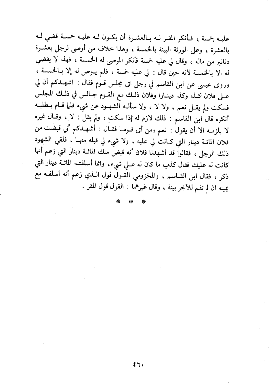 عليه خمسة فأنكر المقر له بالعشرة أن يكون له عليه خمسة قضي له بالعشرة وعلى الورثة البينة الخمسة وهذا خلاف من أوصى لرجل بعشرة دنانير من ماله وقال لي عليه خمسة فأنكرالموصى له الخمسة فهذا لا يقضي له إلا بالخمسة لأنه حيقن قال لي عليه مسة فلم يوص له إلا بالخمسة وروى عيسى عن ابن القاسم في رجل أتى مجلس قوم فقال أشهدكم أن لي على فلان كذا وكذا دينارا وفلان ذلك مع القوم جالس في ذلك المجلس فسكت ولم يقل نعم ولا لا ولا سأله الشهود عن شيسء فلما قام يطلبه انكره قال ابن القاسم ذلك لازم له إذا سكت ولم يقل لا وقال غيره لا يلزمه إلا أن يقول نعم ومن أتى قوما فقال أشهدكم أني قبضت من فلان المائة دينار التي كانت لي عليه ولا شيء لي قبله منها فلقي الشهة ود ذلك الرجل فقالوا قد أشهدنا فلان أنه قبض منك المائة دينار التي زعم أنها كانت له عليك فقال كذب ما كان له علي شيء وإنما أسلفته المائة دينار التي ذكر فقال ابن القاسم والمخزومي القول قول الذي زعم أنه أسلفه مع يمينه إن لم تقم للآخر بينة وقال غيرهما القول قول المقر
