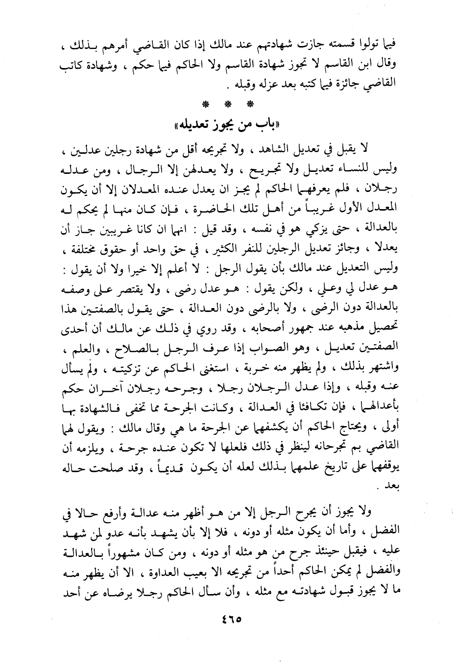 فيما تولوا قسمته جازت شهادتهم عند مالك إذا كان القاضي أرهم بذلك وقال ابن القاسم لا تجوز شهادة القاسم ولا الحاكم فيما حكم وشهادة كاتب القاضي جائزة فيما كتبه بعد عزله وقبله باب من يجوز تعديله لا يقبل في تعديل الشاهد ولا تجريحه أقل من شهادة رجلين عدلين وليس للنساء تعديل ولا تجريح ولا يعدلهن إلا الرجال ومن عدله رجلان فلم يعرفهما الحاكم للم يجز أن يعدل عنده المعدلان إلا أن يكون المعدل الأول غريبا من أهل تلك الحاضرة فإن كان منها لم يحكم له بالعدالة حتى يزكي هو في نفسه وقد قيل إنهما إن كانا غريبين جاز أن يعدلا وجائز تعديل الرجلين للنفر الكثير في حق واحد أو حقوق مختلفة وليس التعديل عند مالك بأن يقول الرجل لا أعلم إلا خيرا ولا أن يقول هو عدل لي وعلي ولكن يقول هو عدل رضى ولا يقتصر على وصفه بالعدالة دون الرضى ولا بالرضى دن العدالة حتى يقول بالصفتين هذا تحصيل مذهبه عند جمهور أصحابه وقد رووي في ذلك عن مالك أن إحدى الصفتين تعديل وهو الصواب إذا عرف الرجل بالصلاح والعلم واشتهر بذلك ولم يظهر منه خربة استغنى الحاكم عن تزكيته ولم يسأل عنه وقبله وإذا عدل الرجلان رجلا وجرحه رجلان آخران حكم بأعدالهما فإن تكافئا في العدالة وكانت الجرحة مما تخفى فالشهادة بها أولى ويحتاج الحاكم أن يكشفهما عن الجرحة ما هي وقال مالك ويقول لهما القاضي بم تجرحانه لينظر في ذلك فلعلها لا تكون عنده جرحة ويلزمه أن يوقفهما على تاريخ علمهما بذلك لعله أن يكون قديما وقد صلحت حاله بعد ولا يجوز أن يجرح الرجل إلا من أظهر منه عدالة وأرفع حالا في الفضل وأما أن يكون مثله أو دونه فلا إلا بأن يشهد بأنه عدو لمن شهد عليه فيقبل حينئذ جرح من هو مثله أو دونه ومن كان مشهورا بالعدالة والفضل لم يمكن الحااكم أحدا من تجريحه إلا بعيب العداوة إلا أن يظهر منه مالا يجوز قبول شهادته مع مثله وأن سأل الحاكم رجلا يرضاه عن أحد