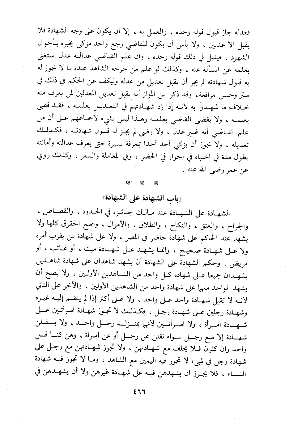 فعدله جاز قبول قوله وحده والعمل به غلا أن يكون على وجه الشهاهدة فلا يقبل إلا عدلين ولا بأس أن يكون للقاضي رجع واحد مزكى يخبره بأحوال الشهود فيقبل في ذلك قوله وحده وإن علم القاضي عدالة عدل اشتغنى ببعلمه عن المسألة عنه وكذلك لو علم من جرحه الشاهد عنده مالا يجوز له به قبول شهادته لم يجز أن يقبل تعديل من عدله وليكف عن الحكم في ذلك في ستر وحسن مرافعة وقد ذكر الن المواز أنه يقبل تعديل المعدلين لمن يعرف منه خلاف ما شهدوا به لأنه إذا رد شهادتهم في التعديل بعلمه فقد قضى بعلمه ولا يقضي القاضي بعلمه وهذا ليس بشيء لإجماعهم على أن من علم القاضي أنه غير عدل ولا رضي لم يجز له قبول شهادته فكذلك تعديله ولا يجوز أن يزكي أحد أحدا بمعرفة يسيرة حتى يعرف عدالته وأمانته بطول مدة في اختباه في الجوار في الحضر وفي المعاملة والسفر وكذلك روي عن عمر رضي الله عنه باب الشهادة على الشهادة الشهادة على الشهادة عند مالك جائزة في الحدود والقصاص والجراح والعتق والنكاح والطلاق والأموال وجميع الحقوق كلها ولا يشهد عند الحاكم على شهادة حاضر في المصر ولا على شهادة من يقرب أمره ولا على شههادة صحيح وإنما يشهد على شهادة ميت أو غائب أو مريض وحكم الشهادة على الشهادة أن يشهد شاهدان على شهادة شاهدين يشهدان جميعا على شهادة كل واحد من الشاهدين الأولين ولا يصح أن يشهد الواحد منهما على شههادة واحد من الشاهدين الولين والآخر على الثاني لأنه لا تقبل شهادة واحد على واحد ولا على أكثر إذا لم ينضم إليه غيره وشهادة رجلين على شهادة رجل فكذلك لا تجوز شهادة امرأتين على شهادة امرأة ولا امرأتين لأنهما بمنزلة رجل واحد ولا ينقلن شهادة إلا مع رجل سواء نقلن عن رجل أو عن امرأة وهن كنا قل واحد وإن كثرن فلا يحلف مع شهادتهن ولا تجوز شهادتهم مع رجل على شهادة رجل في شيء لا تجوز فيه اليمين مع الشاهد وما لا تجوز فيه شهادة النساء فلا يجوز أن يشهدهن فيه على شهادة غيرهن ولا أن يشهدهن في