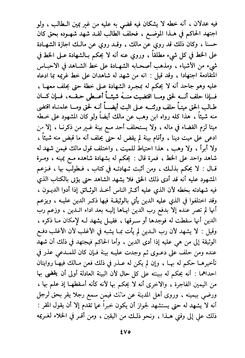 فيه عدلان أنه خطه لا يشكان يه قضي به عليه من غير يمين الطالب ولو اجتهد الحكم في هذا الموضع فحلف الطالب لقد شهد شهودده بحق كان حسنا وكان ذلك قد روي عن مالك وقد روي عن مالك إجازة الشهادة على الخط في كل شيء مطلقا وروي عنه أنه لا يحكم بالشهادة على الخط في شيء من الأشياء ومذهب أصابه الشهادة على خط الشاهد في الأحباس المتقادمة اجتهادا وقد قيل إنه من شهد له شاهدان على خط غريمه بما ادعاه عليه وهو جاحد أنه لا يحكم له بمجرد الشهادة على خطة حتى يحلف معها فإذا حلف أنه لق وما اقتضيت منه شيئا أعطي حقه فإن كان طالب الحق ميتا حلف ورثته على البت أيضا أنه لحق وما علمناه اقتضى منه شيئا هذا كله رواه ابن وهب عن مالك أيضا ولو كان المشهود على خطه ميتا لزم القضاء في ماله ولا يستحلف أحاد مع بينة غير من ذكرنا إلا من ادعى على ميت دينا وأقام بينة لم يقض له حتى يحلف أنه ما قبض منه شيئا ولا أبرأ ولا وهب هذا احتياط للميت واختلف قول مالك فيمن شهد له شاهد واحد على الخط فمرة قال يكم له بشهادة شاهده مع يمينه ومرة قال لا يحكم بذلك ومن أثبت شهادته في كتاب فطولب بها فزعم المشهود عليه أنه قد أدى ذلك الحق فلا يشهد الشاهد حتى يؤتى بالكتاب الذي فيه شهادته بخطه لأن الذي عليه أكثر الناس أخذ الوثائق إذا أدوا الديون وقد اختلفوا في الذي عليه الدين يأتي بالوثيقة فيها ذكر الدين عليه ويزعم أنها لم تصر عنده إلا بدفع رب الدين إياها إليه بعد أداء الدين وزعم رب الدين أنها سقطت له فوجدها أو سرقها فقيل يشهد له لإمكان ما ذكره وقيل لا يشهد لأن رب الدين لم يأت بما يشبه في الأغلب لأن الأغلب دفع الوثيقة إلى من هي عليه إذا أدى الدين وأما الحاكم فيجتهد في ذلك أن شهد عنده ومن حلف على دعوى ثم وجدت عليه بينة فإن كان للمدعي عذر في تأخيرها حكم له بها وإن لم يكن فه عذر في ذلك لعن مالك فيها روايتان إحداهما أنه يحكم له ببينته على كل حال لأن البينة العادلة أولى أن يقضى بها من اليمين الفاجرة والأخرى أنه لا يجحكم بها لأنه كأنه أسقطها إذ علم بها ورضي بيمينه وروى أهل المدينة عن مالك فيمن سمع رجلا يقر بحق لرجل أنه لا يشهد له حتى يستشهد لجوا أن يكون خبرا عما تقدم إلا أن يقول المقر ذلك علي إلى وقتي هذا ونحو ذلك من اليقين ومن أقر في الخلاء لغريمه