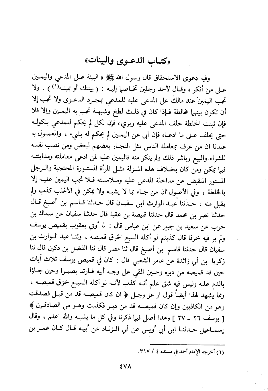وفيه دعوى الاستحقاق قال رسول الله صلى الله عليه وسلم البينة على المدعي واليمين على من أنكر وقال لأحد رجلين تخاصما إليه بيننك أو يمينه ولا تجب اليمين عند مالك على المدعى عليه للمدعي بمجرد الدعوى ولا تجب إلا أن تكون بينهما مخالطة فإذا كان في ذلك لطخ وشبهة تجب به اليمين وإلا فلا فإن ثبتت الخلطة حلف المدعى عليه وبرئ فإن نكل لم يحكم للمدعي بنكوله حتى يحلف على ما ادعاه فإن أبى عن اليمين لم يحكم له بشيء والمعمول به عندنا أن من عرف بمعاملة الناس مثل التجار بعضهم لبعض ومن نصب نفسه للشراء والبيع وباشر ذلك ولم ينكر منه فاليمين عليههه لمن ادعى معاملته ومداينته فيما يمكن ومن كان بخلاف هذه المنزلة مثل المرأة المستورة المحتجبة والرجل المستور المنقبض عن مداخلة المدعى عليه وملامسته فلا تجب اليمين عليه إلا بالخلطة وفي الأصول أن من جاء بما لا يشبه ولا يمكن في الأغلب كذب ولم يقبل منه حدثنا عبدالوارث بن سفيان قال حدثنا قاسم بن أصبغ قال حدثنا نصر بن محمد قال حدثنا قبيصة بن عقبة قال حدثنا سفيان عن سماك بن حرب عن سعيد بن جبير عن ابن عباس قال لما أوتي يعقوب بقميص يوسف ولم ير فيه خرقا قال كذبتم لو أكله السبع لخرق قميصه وثنا عبدالوارث بن سفيان قال حدثنا قاسم بن أصبغ قال ثنا مضر قال ثنا الفضل بن دكين قال ثنا زكريا بن أبي زائدة عن عامر الشعبي قال كان في قميص يوسف ثلاث ى يات حين قد قميصه من دبره وحين ألقي على وجه أبيه فارتد بصيرا وحين جاؤوا بالدم عليه وليس فيه شق علم أنه كذب لأنه لو أكله السبع خزق قميصه ومما يشهد لهذا أيضا قول الله عز وجل إن كان قميصه قد من قبل فصدقت وهو من الكاذبين وإن كان قميصه قد من دبر فكذبت وهو من الصادقين يوسف وهذا أصل فيما ذكرنا وفي كل ما يشبه والله أعلم وقال إسماعيل حدثنا ابن أبي أويس عن أبي الزناد عن أبيه قال كان عمر كتاب الدعوى والبينات وفيه دعوى الاستحقاق قال رسول الله صلى الله عليه وسلم البينة على المدعي واليمين على من أنكر وقال لأحد رجلين تخاصما إليه بينتك أو يمنيه ولا تجب اليمين عند مالك على المدعى عليه للمدعي بمجرد الدعوى ولا تجب إلا أن تكون بينهما مخالطة فإذا كان في ذلك لطخ وشبهة تجب به اليمين وإلا فلا فإن ثبتت الخلطة حلف المدعى عليه وبريء نكل يحكم للمدعي بنكوله حتى يحلف على ما ادعاه فإن أبى عن اليمين لم يحكم له بشيء والمعمول به عندنا أن من عرف بمعاملة الناس مثل التجارة بعضهم لبعض ومن نصب نفسه للشراء والبيع وباشر ذلك ولم ينكر منه فاليمين عليه لمن ادعى معاملته ومداينته فيها يمكن ومن كنا بخلاف هذه المنزلة مثل المرأة المستورة المحتجبة والرجل المستور المنقبض عن مداخلة المدعى عليه وملامسته فلا تجب اليمين عليه إلا بالخلطة وفي الأول أن من جاء بما لا يشبه ولا يمكن في الإلب كذب ولم يقبل منه حدثنا عبدالوارث ابن سفيان قال حدثنا قاصم بن أصبع قال حدثنا نصر بن محمد قال حدثنا قبيصة بن عقبة قال حدثنا سفيان عن سماك بن حرب عن سعيد بن جبير عن ابن عباس قال لما أوتي يعقوب بقميص يوسف ولم ير فيه خرقا قال كذبتم ولو أكله السبع لخرق قميصه وثنا عبدالوارث بن سفيان قال حدثنا قاسم بن أصبغ قال ثنا مضر قال ثنا الفصل بن دكين قال ثنا زكريا بن أبي زائدة عن عامر الشعبي قال كان في قميص يوسف ثلاث آيات حين قد قميصه من دبره وحين ألقي على وجه أبيه فارتد بصيرا وحين جاؤا بالدم عليه وليس فيه شق علم أنه كذب لأنه لو أكله السبع خزق قميصه ومما يشهد لهذا أيضا قول الله عز وجل إن كان قميصه قد من قبل فصدقت وهو من الكاذبين وإن كان قميصه قد من دبر فكذبت وهو من الصادقين يوسف وهذا أصل فيما ذكرنا وفي كل ما يشبه والله أعلم وقال إسماعيل حدثنا ابن أبي أويس عن أبي الزناد عن أبيه قال كان عمر بن