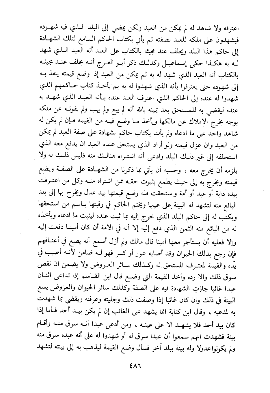 اعترفه ولا شاهد له لم يمكن من العبد ولكن يمضي الى البلد الذي فيه شهوده فيشهدون على ملكه للعبد بصفته ثم يأتي بكتاب الحاكم السامع لتلك الشهاده الى حاكم هذا البلد ويحلف عند مجيئه بالكتاب على العبد انه العبد الذي شهد له به هكذا حكى اسماعيل وكذلك ذكر ابو الفرج أنه يحلف عند مجيئه بالكتاب أنه العبد الذي شهد له به ثم يمكن من العبد اذا وضع قيمته ينفذ به الى شهوده حتى يعترفوا بأنه الذي شهدوا له به بم يأخذ كتاب حاكمهم الذي شهدوا له عنده الى الحاكم الذي اعترف العبد عنده بأنه العبد الذي شهد به عنده ليقضي به للمستحق بعد يمينه بالله انه لم يبع ولم يهب ولم يفوته عن ملكه بوجه يخرج الاملاك عن مالكها ويأخذ ما وضع فيه من القيمه فإن لم يكن له شاهد واحد على ما ادعاه ولم يأت بكتاب حاكم بشهادة على صفة العبد لم يمكن من العبد وان عزل قيمته ولو اراد الذي يستحق عنده العبد ان يدفع معه الذي استحلفه الى غير ذلك البلد وادعى أنه اشتراه هنالك منه فليس ذلك له ولا يلزمه أن يخرج معه وحسبه أن يأتي بما ذكرنا من الشهادة على الصفة ويضع قيمته ويخرج به الى حيث يطمع بثبوت حقه ممن اشتراه منه وكل من اعترفت بيده دابة أو عبد أو امه واستحقت فله وضع قيمتها بيد عدل ويخرج بها الى بلد البائع منه لتشهد له البينه على عينها ويختم الحاكم في رقبتها باسم من استحقها ويكتب له الى حاكم البلد الذي خرج اليه بما ثبت عنده ليثبت ما ادعاه ويأخذه له من البائع منه الثمن الذي دفع اليه إلا انه في الامة ان كان أمينا دفعت اليه وإلا فعليه أن يستأجر معها أمينا قال مالك ولم ازل أسمع أنه يطبع في أعناقهم فإن رجع بذلك الحيوان وقد أصابه عور أو كسر فهو له ضامن لأنه أصيب في يده والقيمة لمعترف المستحق له وكذلك سائر العروض ولا يضمن أن نقص سوق ذلك والا رده وأخذ القيمة التي وضع قال ابن القاسم إذا تداعى اثنان عبدا غائبا جازت الشهادة فيه على الصفة وكذلك سائر الحيوان والعروض يسع البينه في ذلك وان كان غائبا اذا وصفت ذلك وجليته وعرفته ويقضي بما شهدت به لمدعية وقال ابن كنابة انما يشهد على الغائب إن لم يكن بيد احد فأما إذا كان بيد أحد فلا يشهد الا على عينه ومن أدعى عبدا أنه سرق منه وأقام بينة فشهدت أنهم سمعوا أن عبد سرق له أو شهدوا له على انه عبده سرق منه ولم يكونوا عدولا وله بينة ببلد اخر فسأل وضع القيمه ليذهب به الى بينته ليشهد