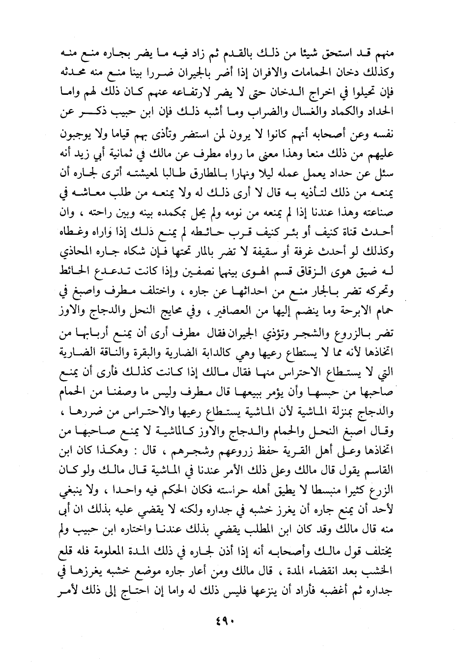 منهم قد استحق شيئا من ذلك بالقدم ثم زاد فيه ما يضر بجاره منع منه وكذلك دخان الحمامات والافران اذا أضر بالجيران ضررا بينا منع منه محدثه فإن تحيلوا في اخراج الدخان حتى لا يضر لارتفاعه عنهم كان ذلك لهم واما الحداد والكماد والعسال والضراب وما اشبه ذلك فإن ابن حبيب ذكر عن نفسه وعن اصحابه انهم كانوا لا يرون لمن استضر وتأذى بهم قياما ولا يوجبون عليهم من ذلك منعا وهذا معنى رواه مطرف عن مالك في ثمانية ابي زيد أنه سئل عن حداد يعمل عمله ليلا ونهارا بالمطارق طالبا لمعيشته أترى لجاره أن يمنعه من ذلك لتأذيه به قال لا أرى ذلك له ولا يمنعه من طلب معاشه في صناعة وهذا عندنا إذا لم يمنعه من نومه ولم يحل بمكمده بينه وبين راحته وان احدث قناة كنيف أو بئر كنيف قرب حائطه لم يمنع ذلك اذا واراه وغطاه وكذلك لو أحدث غرفة أو سقيفة لا تضر بالمار تحتها فإن شكاه جاره المحاذي له ضيق هوى الزقاق قسم الهوى بينهما نصفين وإذا كانت تدعدع الحائط وتحركه تضر بالجار منع من احداثها عن جاره واختلف مطرف واصبغ في حمام الابرحة وما ينضم إليها من العصافير وفي محايج النحل والدجاج والأوز تضر بالزروع والشجر وتؤذي الجيران فقال مطرف أرى أن يمنع أربابها من اتخاذها لأنه مما لا يستطاع رعيها وهي كالدابة الضارية والبقرة والناقة الضارية التي لا يستطاع الاحتراس منها فقال مالك إذا كانت كذلك فأرى أن يمنع صاحبها من حبسهعا وأن يؤمر ببيعها قال مطرف وليس ما وصفنا من الحمام والدجاج بمنزلة الماشية لأن الماشية يستطاع رعيها والاحتراس من ضررها وقال اصبغ النحل والحمام والدجاج والأوز كالماشية لا يمنع صاحبها من اتخاذها وعلى أهل القرية حفظ زروعهم وشجرهم قال وهكذا كان ابن القاسم يقول قال مالك وعلى ذلك الأمر عندنا في الماشية قال مالك ولو كان الزرع كثيرا منبسطا لا يطيق أهله حراسته فكان الحكم فيه واحدا ولا ينبغي لأحد أن يمنع جاره أن يغرز خشبة في جداره ولكنه لا يقضي عليه بذلك ان أبى منه قال مالك وقد كان ابن المطلب يقضي بذلك عندنا واختاره ابن حبيب ولم يختلف قول مالك وأصحابه أنه إذا أذن لجاره في ذلك المدة المعلومة فله قلع الخشب بعد انقضاء المدة قال مالك ومن أعار جاره موضع خشبه يغرزها في جداره ثم أغضبه فأراد أن ينزعها فليس ذلك له واما إن احتاج إلى ذلك الأمر