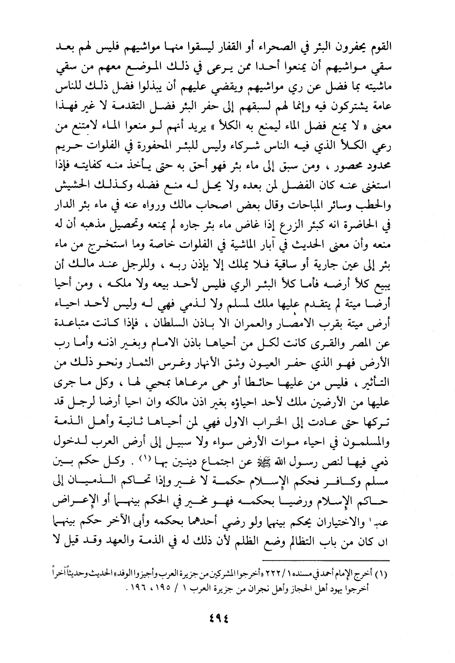 القوم يحفرون البئر في الصحراء أو القفار ليسقوا منها مواشيهم فليس لهم بعد سقي مواشيهم أن يمنعوا أحدا ممن يرعى في ذلك الموضع معهم من سقى ماشيته بما فضل عن ري مواشيهم ويقضي عليهم أن يبذلوا فضل ذلك للناس عامة يشتركون فيه وانما لهم لسبقهم الى حفر البئر فضل التقدمة لا غير فهذا معنى لا يمنع فضل الماء ليمنع به الكلأ يريد انهم لو منعوا الماء لامتنع من رعي الكلأ الذي فيه الناس شركاء وليس للبئر المحفورة في الفلوات حريم محدود محصور ومن سبق الى ماء بئر فهو أحق به حتى يأخذ منه كفايته فإذا استغنى عنه كان الفضل لمن بعده ولا يحل له منع فضله وكذلك الحشيش والحطب وسائر المباحات وقال بعض اصحاب مالك ورواه عنه في ماء بئر الدار في الحاضرة انه كبئر الزرع إذا غاض ماء بئر جاره لم يمنعه وتحصيل مذهبه أن له منعه وأن معنى الحديث في أبار الماشيه في الفلوات خاصة وما استخرج من ماء بئر الى عين جاريه او ساقية فلا يملك الا بإذن ربه وللرجل عند مالك ان يبيع كلأ أرضه فأما كلأ البئر الري فليس لاحد بيعه ولا ملكه ومن احيا أرضا ميتة لم يتقدم عليها ملك لمسلم ولا لذمي فهي له وليس لاحد احياء أرض ميتة بقرب الامصار والعمران الا بإذن السلطان فإذا كانت متباعده عن المصر والقرى كانت لكل من احياها بإذن الامام وبغير إذنه وأما رب الارض فهو الذي حفر العيون وشق الانهار وغرس الثمار ونحو ذلك من التأثير فليس من عليها حائطا أو حمى مرعاها بمحيي لها وكل ما جرى عليها من الارضين ملك لاحد احياؤه بغير اذن مالكه وان احيا أرضا لرجل قد تركها حتى عادت الى الخراب الاول فهي لمن احياها ثانية وأهل الذمة والمسلمون في احياء موات الارض سواء ولا سبيل الى أرض العرب لدخول ذمي فيها لنص رسول الله صلى الله عليه وسلم عن اجتماع دينين بها وكل حكم بين مسلم وكافر فحكم الإسلام حكمه لا غير وإذا تحاكم الذميان الى حاكم الإسلام ورضيا بحكمه فهو مخير في الحكم بينهما أو الإعراض عنهما والاختياران يحكم بينهما ولو رضي احدهما بحكمه وأبى الاخر حكم بينهما ان كان من باب التظالم وضع الظلم لأن ذلك له في الذمة والعهد وقد قيل لا