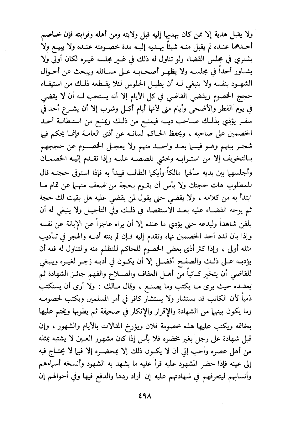 ولا يقبل هدية إلا ممن كان بهديها إليه قبل ولايته ومن أهله وقرابته فإن خاصم أحدهما عنده لم يقبل منه شيئا يهديه إليه مدة خصومته عنده ولا يبيع ولا يشتري في مجلس القضاء ولو تناول له ذلك في غير مجلسه غيره لكان أولى ولا يشاور أحدا في مجلسه ولا يظهر أصحابه على مسائله ويبحث عن أحوال الشهود بنفسه ولا ينبغي له أن يطيل الجلوس لئلا يقطعه ذلك من استيفاء حجج الخصوم ويقضي القاضي في كل الأيام إلا أنه يستحب له أن لا يقضي في يوم الفطر والأضحى وأيام منى لأنها أيام أكل وشرب إلا أن يشرع أحد في سفر يؤذي بذلك صاحب دينه فيمنع من ذلك ويمنع من استطالة احد الخصمين على صاحبه ويحفظ الحاكم لسانه عن أذى العامة فإنما يحكم فيما شجر بينهم وهو فيما بعد واحد منهم ولا يعجل الخصوم عن حججهم بالتخويف الا من استرابه وخشي تلصصه عليه واذا تقدم اليه الخصمان واجلسهما بين يديه سألهما مالكا وايكما الطالب فيبدأ به فإذا استوفى حجته قال للمطلوب هات حجتك ولا بأس أن يقوم بحجة من ضعف منهما عن تمام ما ابتدأ به من كلامه ولا يقضي حتى يقول لمن يقضى عليه هل بقيت لك حجة ثم يوجه القضاء عليه بعد الاستقصاء في ذلك وفي التأجيل ولا ينبغي له أن يلقن شاهدا وليدعه حتى يؤدي ما عنده إلا أن يراه عاجزا عن الابانه عن نفسه وإذا بان لدد احد الخصمين نهاه وتقدم اليه فإن لم ينته أدبه والهجر في تأديب مثله اولى وإذا كثر اذى بعض الخصوم للحاكم للتظلم منه والتناول له فله أن يؤدبه على ذلك والصفح أفضل إلا أن يكون في أدبه زجر لغيره وينبغي للقاضي أن يتخير كاتبا من أهل العفاف والصلاح والفهم جائز الشهادة ثم يعقده حيث يرى ما يكتب وما يصنع وقال مالك ولا أرى أن يستكتب ذميا لأن الكاتب قد يستشار ولا يستشار كافر في امر المسلمين ويكتب لخصومه وما يكون بينهما من الشهادة والإقرار والإنكار في صحيفة ثم يطويها ويختم عليها بخاتمه ويكتب عليها هذه خصومة فلان ويؤرخ المقالات بالأيام والشهور وإن قبل شهادة على رجل بغير محضره فلا بأس إذا كان مشهور العين لا يشتبه بمثله من أهل عصره وأحب إلي أن لا يكون ذلك إلا بمحضره إلا فيما لا يحتاج فيه إلى عينه فإذا حضر المشهود عليه قرأ عليه ما يشهد به الشهود وأنسخه أسماءهم وأنسابهم ليتعرفهم في شهادتهم عليه إن أراد ردها والدفع فيها وفي أحوالهم أن