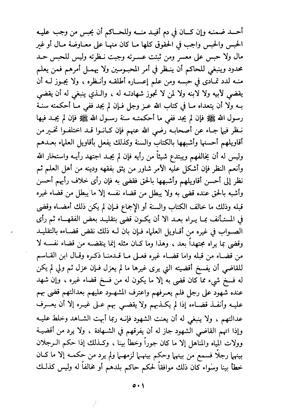 أحد ضمنه وإن كان في دم افيد منه وللحاكم أن يحبس من وجب عليه الحبس والحبس واجب في الحقوق كلها ما كان منها على معاوضة مال أو غير مال ولا حبس على معسر ومن ثبتت عسرته وجبت نظرته وليس للحبس حد محدود وينبغي للحاكم أن ينظر في امر المحبوسين ولا يهمل أمرهم فمن يعلم منه لدد تمادى في حبسه ومن علم إعساره أطلقه وأنظره ولا يجوز له أن يقضي لأبيه ولا لابنه ولا لمن لا تجوز شهادته له والذي ينبغي له أن يقضي به ولا أن يتعداه ما في كتاب الله عز وجل فإن لم يجد ففي ما أحكمته سنة رسول الله صلى الله عليه وسلم فإن لم يجد ففي ما أحكمته سنة رسول الله صلى الله عليه وسلم فإن لم يجد فيها نظر فيما جاء عن اصحابه رضي الله عنهم فإن كانوا قد اختلفوا تخير من اقاويلهم أحسنها وأشبهها بالكتاب والسنة وكذلك يفعل بأقاويل العلماء بعدهم وليس له أن يخالفهم ويبتدع شيئا من رأيه فإن لم يجد اجتهد رأيه واستخارالله وأنعم النظر فإن أشكل عليه الامر شاور من يثق بفقهه ودينه من اهل العلم ثم نظر الى احسن اقاويلهم وأشبهها بالحق فقضى به فإن رأى خلاف رأيهم أحسن وأشبه بالحق عنده قضى به ولا يبطل من قضاء نفسه الا ما يبطل من قضاء غيره قبله وذلك ما خالف الكتاب والسنه او الاجماع فإن لم يكن ذلك أمضاه وقضى في المستأنف بما يراه بعد الا ان يكون قضى بتقليد بعض الفقهاء ثم رأى الصواب في غيره من اقاويل العلماء فإن بان له ذلك نقض قضاءه بالتقليد وقضى بما يراه مجتهدا بعد وهذا وما كان مثله إنما ينقضه من قضاء نفسه لا من قضاء من قبله واما قضاء غيره فعلى ما قدمنا ذكره وقال ابن القاسم للقاضي ان يفسخ أقضيته التي يرى غيرها ما لم يعزل فإن عزل ثم ولي لم يكن له فسخ شيء مما كان قضى به الا ما يكون له من فسخ قضاء غيره وإن شهد عنده شهود على رجل فلم يعرفهم واعترف المشهود عليهم بعدالتهم قضى بهم عليه وانفذ قضاءه اذا لم يكذبهم ولا يقضي بهم على غيره الا ان يعرف عدالتهم ولا ينبغي له ان يعنت الشهود فإنه ربما أبهت الشاهد وخلط عليه واذا اتهم القاضي الشهود جاز له ان يفرقهم في الشهادة ولا يرد من أقضيه وولات المياه والمناهل إلا ما كان جورا وخطأ بينا وكذلك اذا حكم الرجلان بينهما رجلا فسمع من بينهما وحكم بينهما لزمهما ولم يرد من حكمه الا ما كان خطأ بينا وسواء كان ذلك موافقا لحكم حاكم بلدهم او مخالفا له وليس كذلك