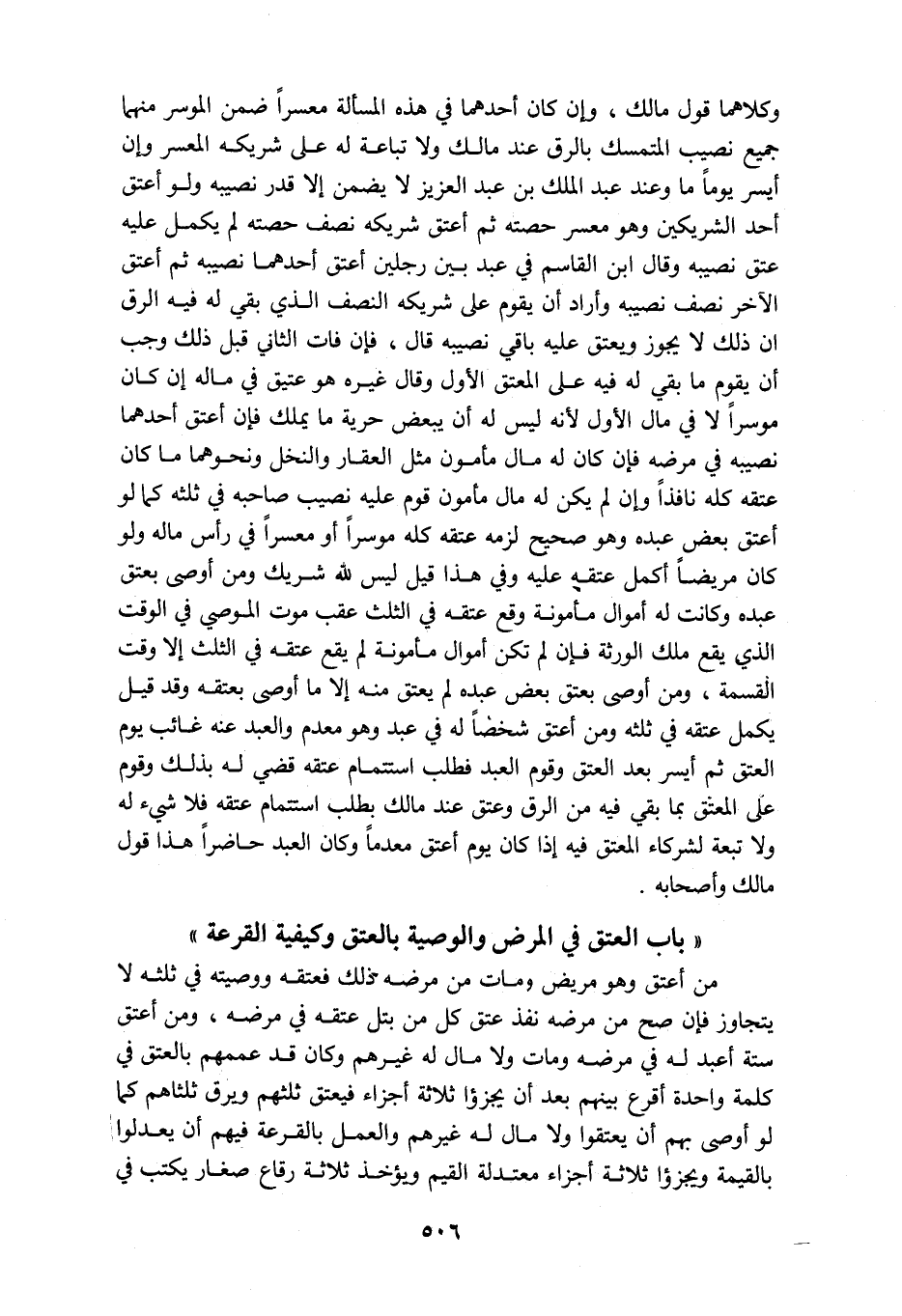 وكلاهما قول مالك وإن كان احدهما في هذه المسأله معسرا ضمن الموسر منهما جميع نصيب المتمسك بالرق عند مالك ولا تباعة له على شريكه المعسر وإن أيسر يوما ما وعند عبدالملك بن عبد العزيز لا يضمن إلا قدر نصيبه ولو أعتق أحد الشريكين وهو معسر حصته ثم أعتق شريكه نصف حصته لم يكمل عليه عتق نصيبه وقال ابن القاسم في عبد بين رجلين أعتق احدهما نصيبه ثم أعتق الآخر نصف نصيبه وأراد أن يقوم على شريكه النصف الذي بقي له فيه الرق ان ذلك لايجوز ويعتق عليه باقي نصيبه قال فإن فات الثاني قبل ذلك وجب أن يقوم ما بقي له فيه على المعتق الأول وقال غيره هو عتيق في ماله إن كان موسرا لا في مال الأول لأنه ليس له أن يبعض حرية ما يملك فإن أعتق أحدهما نصيبه في مرضه فإن كان له مال مأمون مثل العقار والنخل ونحوهما ما كان عتقه كله نافذا وإن لم يكن له مال مأمون قوم عليه نصيب صاحبه في ثلثه كما لو أعتق بعض عبده وهوصحيح لزمه عتقه كله موسرا أو معسرا في رأس ماله ولو كان مريضا أكمل عتقه عليه وفي هذا قيل ليس لله شريك ومن اوصى بعتق عبده وكانت له اموال مأمونه وقع عتقه في الثلث عقب موت الموصي في الوقت الذي يقع ملك الورثه فإن لم تكن أموال مأمونه لم يقع عتقه في الثلث إلا وقت القسمة ومن أوصى بعتق بعض عبده لم يعتق منه إلا ما أوصى بعتقه وقد قيل يكمل عتقه في ثلثه ومن اعتق شخصا له في عبد وهو معدم والعبد عنه غائب يوم العتق ثم أيسر بعد العتق وقوم العبد فطلب استتمام عتقه قضى له بذلك وقوم على المعتق بما بقي فيه من الرق وعتق عند مالك بطلب استتمام عتقه فلا شيء له ولا تبعه لشركاء المعتق فيه اذا كان يوم أعتق معدما وكان العبد حاضرا هذا قول مالك واصحابه باب العتق في المرض والوصية بالعتق وكيفية القرعة من اعتق وهو مريض ومات من مرضه ذلك فعتقه ووصيته في ثلثه لا يتجاوز فإن صح من مرضه نفذ عتق كل من بتل عتقه في مرضه ومن اعتق ستة أعبد له في مرضه ومات ولا مال له غيرهم وكان قد عممهم بالعتق في كلمه واحدة أقرع بينهم بعد أن يجزؤا ثلاثة أجزاء فيعتق ثلثهم ويرق ثلثاهم كما لو أوصى بهم أن يعتقوا ولا مال له غيرهم والعمل بالقرعه فيهم أن يعدلوا بالقيمة ويجزؤا ثلاثة أجزاء معتدلة القيم ويؤخذ ثلاثة رقاع صغار يكتب في