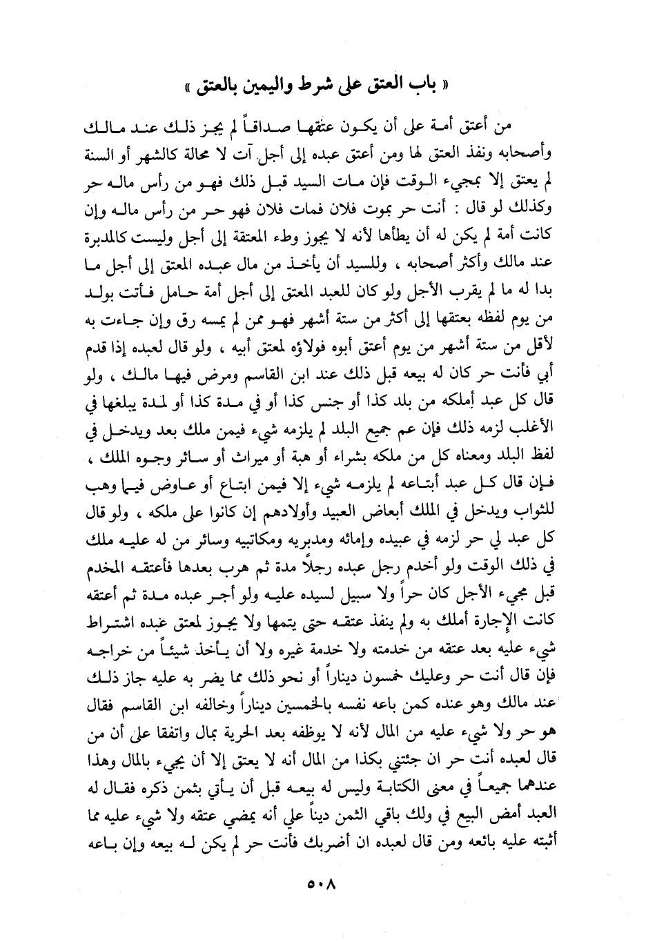 باب العتق على شرط واليمين بالعتق من اعتق أمة على أن يكون عتقها صداق لم يجز ذلك عند مالك وأصحابه ونفذ العتق لها ومن أعتق عبده الى أجل آت لا محالة كالشهر أو السنه لم يعتق الا بمجيء الوقت فإن مات السيد قبل ذلك فهو من رأس ماله حر وكذلك لو قال أنت حر بموت فلان فمات فلان فهو حر من رأس ماله وإن كانت أمه لم يكن له أن يطأها لانه لا يجوز وطء المعتقه الى اجل وليست كالمدبره عند مالك وأكثر أصحابه وللسيد أن يأخذ من مال عبده المعتق الى اجل ما بدا له مالم يقرب الاجل ولو كان للعبد المعتق الى اجل أمه حامل فأتت بولد من يوم لفظه بعتقها الى أكثر من ستة أشهر فهو ممن لم يمسه رق وإن جاءت به لاقل من ستة أشهر من يوم أعتق أبوه فولاؤه لمعتق أبيه ولو قال لعبده اذا قدم أبي فأنت حر كان له بيعه قبل ذلك عند ابي القاسم ومرض فيها مالك ولو قال كل عبد املكه من بلد كذا أو جنس كذا او في مدة كذا او لمدة يبلغها في الاغلب لزمه ذلك فإن عم جميع البلد لم يلزمه شيء فيمن ملك بعد ويدخل في لفظ البلد ومعناه كل من ملكه بشراء أو هبة او ميراث أو سائر وجوه الملك فإن قال كل عبد ابتاعه لم يلزمه شيء إلا فيمن ابتاع او عاوض فيما وهب للثواب ويدخل في الملك ابعاض العبيد وأولادهم إن كانوا على ملكه ولو قال كل عبد لي حر لزمه في عبيده وإمائه ومدبريه ومكاتبيه وسائر من له عليه ملك في ذلك الوقت ولو أخدم رجل عبده رجلا مدة ثم هرب بعدها فأعتقه المخدم قبل مجيء الاجل كان حرا ولا سبيل لسيده عليه ولو أجر عبده مدة ثم اعتقه كانت الاجارة أملك به ولم ينفذ عتقه حتى يتمها ولا يجوز لمعتق عبده اشتراط شيء عليه بعد عتقه من خدمته ولا خدمة غيره ولا ان يأخذ شيئا من خراجه فإن قال أنت حر وعليك خمسون دينارا او نحو ذلك مما يضر به عليه جاز ذلك عند مالك وهو عنده كمن باعه نفسه بالخمسين دينارا وخالفه ابن القاسم فقال هو حر ولا شيء عليه من المال لأنه لايوظفه بعد الحرية بمال واتفقا على ان من قال لعبده أنت حر ان جئتني بكذا من المال انه لا يعتق الا ان يجيء بالمال وهذا عندهما جميعا في معنى الكتابه وليس له بيعة قبل أن يأتي بثمن ذكره فقال له العبد امض البيع في ولك باقي الثمن دينا على انه يمضي عتقه ولا شيء عليه مما أثبته عليه بائعه ومن قال لعبده ان اضربك فأنت حر لم يكن له بيعه وان باعه