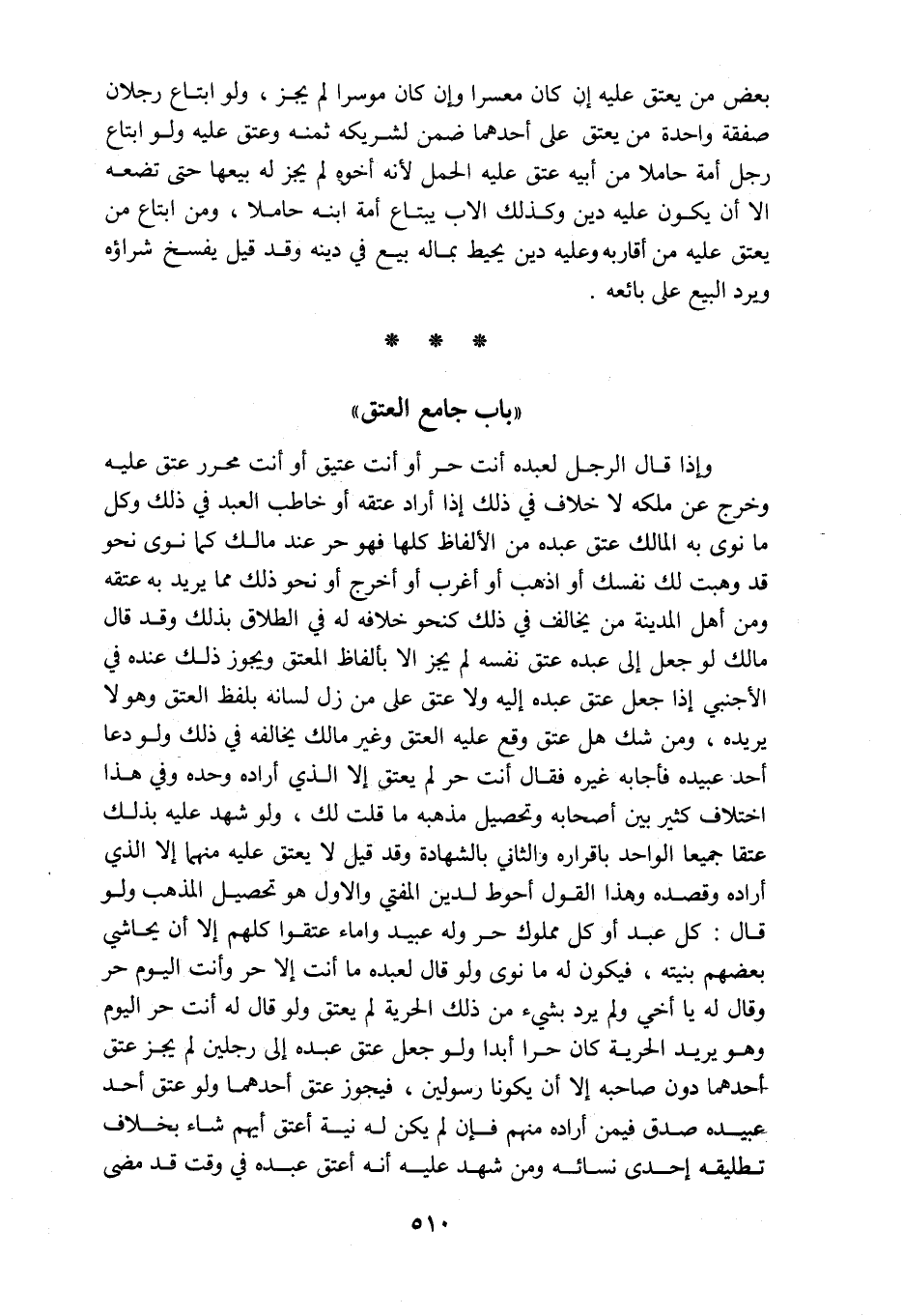 بعض من يعتق عليه ان كان معسرا وان كان موسرا لم يجز ولو ابتاع رجلان صفقه واحده من يعتق على احدهما ضمن لشريكه ثمنه وعتق عليه ولو ابتاع رجل أمة حاملا من ابيه عتق عليه الحمل لانه أخوه لم يجز له بيعها حتى تضعه الا ان يكون عليه دين وكذلك الاب يبتاع أمة ابنه حاملا ومن ابتاع من يعتق عليه من اقاربه وعليه دين يحيط بماله بيع في دينه وقد قيل يفسخ شراؤه ويرد البيع على بائعه باب جامع العتق واذا قال الرجل لعبده أنت حر او انت عتيق أو انت محرر عتق عليه وخرج عن ملكه لاخلاف في ذلك اذا اراد عتقه او خاطب العبد في ذلك وكل ما نوى به المالك عتق عبده من الالفاظ كلها فهو حر عند مالك كما نوى نحو قد وهبت لك نفسك أو اذهب أو أغرب أو أخرج أو نحو ذلك مما يريد به عتقه ومن اهل المدينه من يخالف في ذلك كنحو خلافه له في الطلاق بذلك وقد قال مالك لو جعل الى عبده عتق نفسه لم يجز الا بألفاظ المعتق ويجوز ذلك عنده في الاجنبي اذا جعل عتق عبده اليه ولا عتق على من زل لسانه بلفظ العتق وهو لا يريده ومن شك هل عتق وقع عليه العتق وغير مالك يخالفه فى ذلك ولو دعا أحد عبيده فأجابه غيره فقال أنت حر لم يعتق إلا الذي أراده وحده وفي هذا اختلاف كثير بين اصحابه وتحصيل مذهبه ما قلت لك ولو شهد عليه بذلك عتقا جميعا الواحد باقراره والثاني بالشهاده وقد قيل لا يعتق عليه منهما الا الذي أراده وقصده وهذا القول أحوط لدين المفتي والاول هو تحصيل المذهب ولو قال كل عبد أو كل مملوك حر وله عبيد واماء عتقوا كلهم الا ان يحاشى بعضهم بنيته فيكون له ما نوى ولو قال لعبده ما انت الا حر وانت اليوم حر وقال له يا اخي ولم يرد بشيء من ذلك الحرية لم يعتق ولو قال له انت حر اليوم وهو يريد الحرية كان حرا ابدا ولو جعل عتق عبده الى رجلين لم يجز عتق أحدهما دون صاحبه إلا أن يكونا رسولين فيجوز عتق أحدهما ولو عتق أحد عبيده صدق فيمن أراده منهم فإن لم يكن له نية أعتق أيهم شاء بخلاف تطليقه إحدى نسائه ومن شهد عليه أنه أعتق عبده في وقت قد مضى