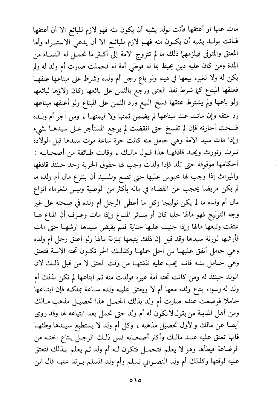 مات عنها او عتقها بولد يشبه أن يكون منه فهو لازم للبائع الا أن اعتقها فأتت بولد يشبه أن يكون منه لازم للبائع إلا ان يدعي الاستبراء وأما المعتق والمتوفى فيلزمهما ذلك مالم تتزوج الامة الى اكثر ما تحمل له النساء من المدة ومن كان عليه دين يحيط بما له فوطيء أمة فحملت صارت أم ولد له ولم يكن له ولا لغيره بيعها في دينه ولو باع رجل أم ولد وشرط على مبتاعها عتقها فعتقها المبتاع كما شرط نفذ العتق ورجع بالثمن على بائعها وكان ولاؤها لبائعها ولو باعها ولم يشترط عتقها فسخ البيع ورد الثمن على المبتاع ولو أعتقها مبتاعها رد عتقه وإن ماتت عند مبتاعها لم يضمن ثمنها ولا قيمتها ومن آجر أم ولده فسخت اجارته فإن لم تفسخ حتى انقضت لم يرجع المستأجر على سيدها بشيء واذا مات سيد الامة وهي حامل منه كانت حره ساعة موت سيدها قبل الولاده ترث وتورث ويحد قاذفها هذا قول مالك وقالت طائفه من اصحابه أحكامها موقوفه حتى تلد فإذا ولدت وجب لها حقوق الحريه وحد حينئذ قاذفها والميراث اذا وجب لها محبوس عليها حتى تضع وللسيد أن ينتزع مال أم ولده ما لم يكن مريضا يحجب عن القضاء في ماله بأكثر من الوصيه وليس للغرماء انزاع مال أم ولده ما لم يكن توليجا وكل ما أعطى الرجل أم ولده في صحته على غير وجه التوليج فهو مالها حليا كان أو سائر المتاع واذا مات وعرف ان المتاع لها عتقت وتبعها مالها واذا جنيت عليها جناية فلم يقبض سيدها ارشها حتى مات فأرشها لورثة سيدها وقد قيل ان ذلك يتبعها بمنزلة مالها ولو اعتق رجل ام ولده وهي حامل أنفق عليها من اجل حملها وكذلك الحر تكون تحته الامة فتعتق وهي حامل منه فانه يجب عليه نفقتها من وقت العتق لا من قبل ذلك لان الولد حينئذ له ومن كانت تحته أمة غيره فولدت منه ثم ابتاعها لم تكن بذلك أم ولد له وسواء ابتاع ولده معها أم لا ويعتق عليه ولده ساعة يملكه فإن ابتاعها حاملا فوضعت عنده صارت أم ولد بذلك الحمل هذا تحصيل مذهب مالك ومن أهل المدينه من يقول لا تكون له ام ولد حتى تحمل بعد ابتياعه لها وقد روي ايضا عن مالك والاول تحصيل مذهبه وكل أم ولد لا يستطيع سيدها وطئها فانها تعتق عليه عند مالك وأكثر اصحابه فمن ذلك الرجل يبتاع اخته من الرضاعه فيطأها وهو لا يعلم فتحمل فتكون أم ولد ثم يعلم بذلك فتعتق عليه لوقتها وكذلك أم ولد النصراني تسلم وأم ولد المسلم يرتد عنها قال ابن
