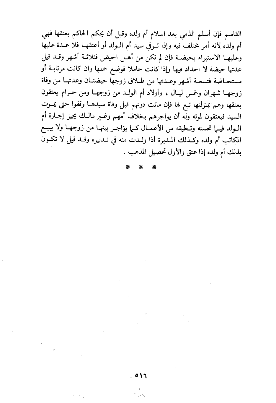 القاسم فإن أسلم الذمي بعد اسلام أم ولده وقبل ان يحكم الحاكم بعتقها فهي أم ولده لانه أمر مختلف فيه واذا توفي سيد أم الولد أو اعتقها فلا عدة عليها وعليها الاستبراء بحيضه فإن لم تكن من اهل الحيض فثلاثة اشهر وقد قيل عدتها حيضه لا احداد فيها واذا كانت حاملا فوضع حملها وان كانت مرتابه أو مستحاضه فتسعة أشهر وعدتها من طلاق زوجها حيضتان وعدتها من وفاة زوجها شهران وخمس ليال واولاد أم الولد من زوجها ومن حرام يعتقون بعتقها وهم بمنزلتها تبع لها فإن ماتت دونهم قبل وفاة سيدها وقفوا حتى يموت السيد فيعتقون لموته وله ان يواجرهم بخلاف أمهم وغير مالك يجيز إجارة أم الولد فيما تحسنه وتطيقه من الاعمال كما يؤاجر بينها من زوجها ولا يبيع المكاتب أم ولده وكذلك المدبره اذا ولدت منه في تدبيره وقد قيل لا تكون بذلك أم ولده اذا اعتق والاول تحصيل المذهب