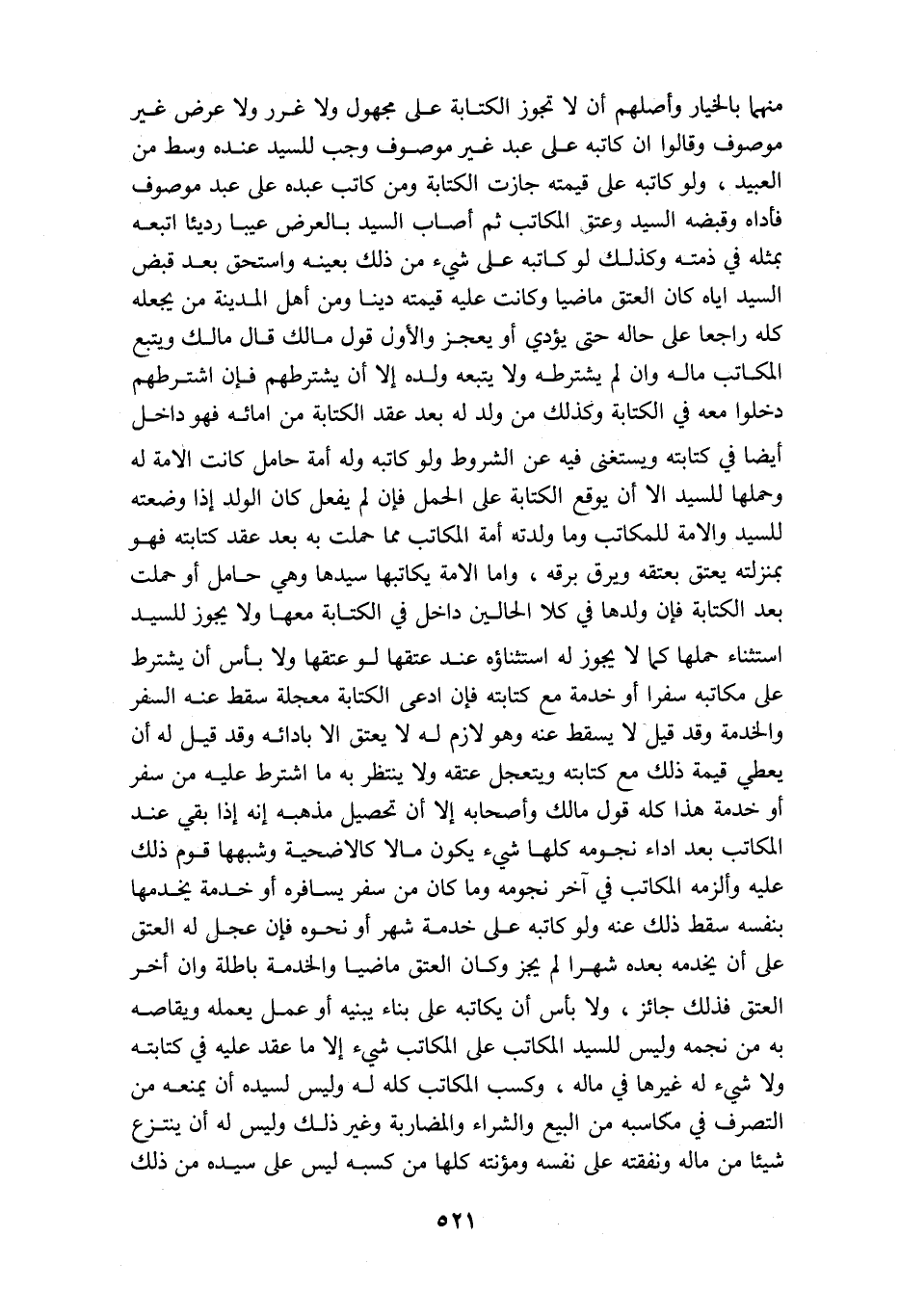 منهما بالخيار واصلهم ان لا تجوز الكتابه على مجهول ولا غرر ولا عرض غير موصوف قالوا ان كاتبه على عبد غير موصوف وجب للسيد عنده وسط من العبيد ولو كاتبه على قيمته جازت الكتابه ومن كاتب عبده على عبد موصوف فأداه وقبضه السيد وعتق المكاتب ثم اصاب السيد بالعرض عيبا رديئا اتبعه بمثله في ذمته وكذلك لو كاتبه على شيء من ذلك بعينه واستحق بعد قبض السيد اياه كان العتق ماضيا وكانت عليه قيمته دينا ومن اهل المدينه من يجعله كله راجعا على حاله حتى يؤدي او يعجز والأول قول مالك قال مالك ويتبع المكاتب ماله وان لم يشترطه ولا يتبعه ولده الا ان يشترطهم فإن اشترطهم دخلوا معه في الكتابه وكذلك من ولد له بعد عقد الكتابه من امائه فهو داخل ايضا في كتابته ويستغنى فيه عن الشروط ولو كاتبه وله أمة حامل كانت الامه له وحملها للسيد الا ان يوقع الكتابه عى الحمل فإن لم يفعل كان الولد اذا وضعته للسيد والامه للمكاتب وما ولدته أمة المكاتب مما حملت به بعد عقد كتابته فهو بمنزلته يعتق بعتقه ويرق برقه واما الامه يكاتبها سيدها وهي حامل او حملت بعد الكتابة فإن ولدها في كلا الحالين داخل في الكتابه معها ولا يجوز للسيد استثناء حملها كما لايجوز له استثناؤه عند عتقها لو عتقها ولا بأس ان يشترط على مكاتبه سفرا او خدمة مع كتابته فإن ادعى الكتابه معجله سقط عنه السفر والخدمة وقد قيل لايسقط عنه وهو لازم له لا يعتق الا بأدائه وقد قيل له ان يعطي قيمته ذلك مع كتابته ويتعجل عتقه ولا ينتظر به ما اشترط عليه من سفر او خدمة هذا كله قول مالك واصحابه الا ان تحصيل مذهبه انه إذا بقي عند المكاتب بعد اداء نجومه كلها شيء يكون مالا كالأضحيه وشبهها قوم ذلك عليه والزمه المكاتب في اخر نجومه وما كان من سفر يسافره او خدمة يخدمها بنفسه سقط ذلك عنه ولو كاتبه على خدمة شهر او نحوه فإن عجل له العتق على ان يخدمه بعده شهرا لم يجز وكان العتق ماضيا والخدمة باطله وان اخر العتق فذلك جائز ولا بأس ان يكاتبه على بناء يبنيه او عمل يعمله ويقاصه به من نجمه وليس للسيد المكاتب على المكاتب شيء الا ما عقد عليه في كتابته ولا شيء له غيرها في ماله وكسب المكاتب كله له وليس لسيده أن يمنعه من التصرف في مكاسبه من البيع والشراء والمضاربه وغير لك وليس له ان ينتزع شيئأ من ماله ونفقته على نفسه ومؤنته كلها من كسبه ليس على سيده من ذلك