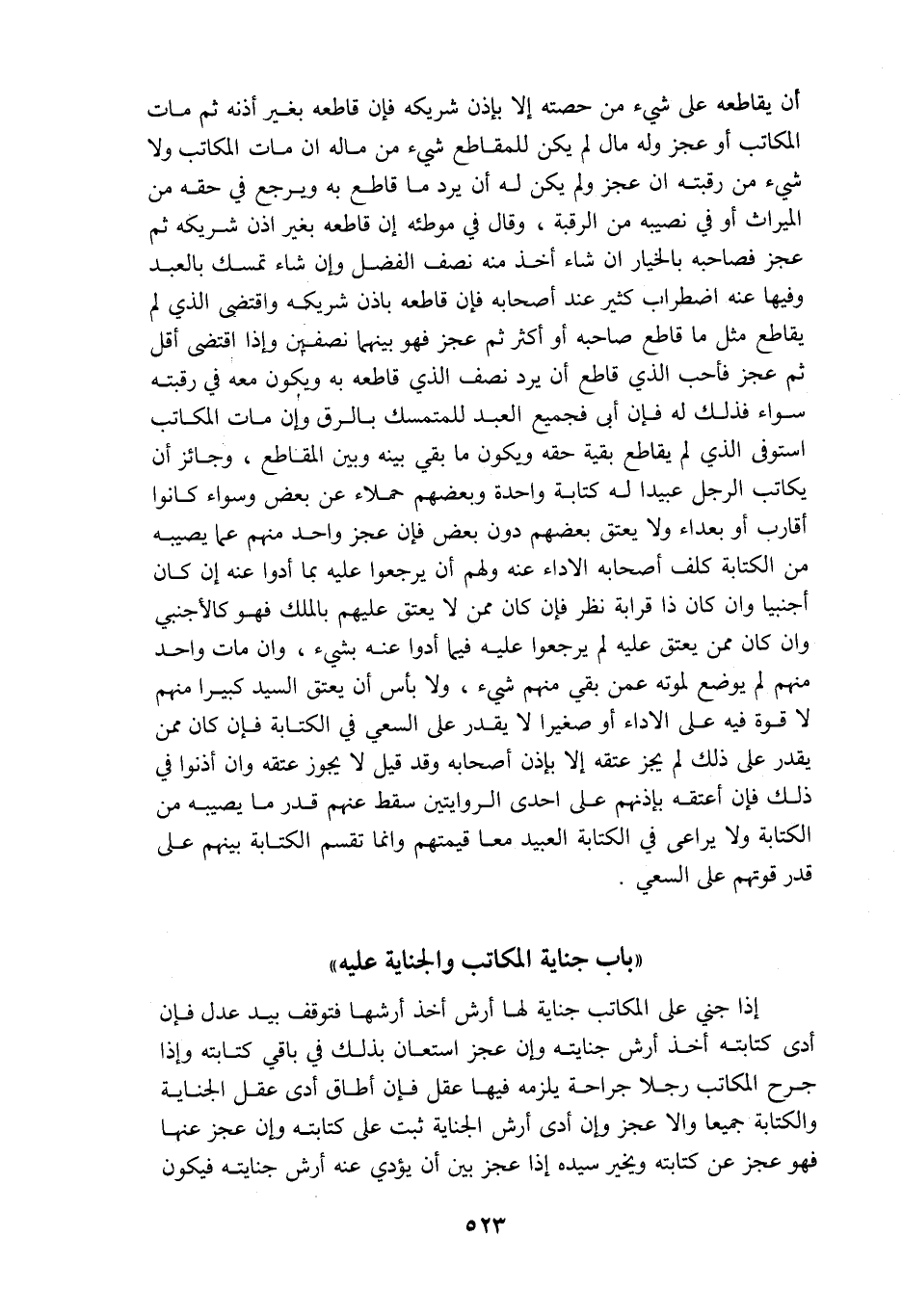 ان يقاطعه على شيء من حصته الا بإذن شريكه فإن قاطعه بغير اذنه ثم مات المكاتب او عجز وله مال لم يكن للمقاطع شيء من ماله ان مات المكاتب ولا شيء من رقبته ان عجز ولم يكن له ان يرد ما قاطع به ويرجع في حقه من الميراث او في نصيبه من الرقبه وقال في موطئه ان قاطعه بغير اذن شريكه ثم عجز فصاحبه بالخيار ان شاء اخذ منه نصف الفضل وان شاء تمسك بالعبد وفيها عنه اضطراب كثير عند اصحابه فإن قاطعه بإذن شريكه واقتضى الذي لم يقاطع مثل ما قاطع صاحبه او اكثر ثم عجز فهو بينهما نصفين واذا اقتضى اقل ثم عجز فأحب الذي قاطع ان يرد نصف الذي قاطعه به ويكون معه في رقبته سواء فذلك له فإن ابى فجميع العبد للمتمسك بالرق وان مات المكاتب استوفى الذي لم يقاطع بقية حقه ويكون ما بقي بينه وبين المقاطع وجائز ان يكاتب الرجل عبيدا له كتابة واحده وبعضهم حملاء عن بعض وسواء كانوا اقارب او بعداء ولا يعتق بعضهم دون بعض فإن عجز واحد منهم عما يصيبه من الكتابه كلف اصحابه الاداء عنه ولهم ان يرجعوا عليه بما ادوا عنه إن كان أجنبيا وان كان ذا قرابه نظر فإن كان ممن لايعتق عليهم بالملك فهو كالأجنبي وان كان ممن يعتق عليه لم يرجعوا عليه فيما أدوا عنه بشيء وان مات واحد منهم لم يوضع لموته عمن بقي منهم شيء ولا بأس ان يعتق السيد كبيرا منهم لا قوة فيه على الاداء او صغيرا لا يقدر على السعي في الكتابة فإن كان ممن يقدر على ذلك لم يجز عتقه الا بإذن اصحابه وقد قيل لا يجوز عتقه وان اذنوا في ذلك فإن اعتقه بإذنهم على احد الروايتين سقط عنهم قدر ما يصيبه من الكتابه ولا يراعى في الكتابه العبيد معا قيمتهم وانما تقسم الكتابه بينهم على قدر قوتهم على السعي باب جناية المكاتب والجنايه عليه اذا جنى على المكاتب جناية لها أرش اخذ أرشها فتوقف بيد عدل فإن أدى كتابته اخذ أرش جنايته وان عجز استعان بذلك في باقي كتابته واذا جرح المكاتب رجلا جراحه يلزمه فيها عقل فإن أطاق أدى عقل الجناية والكتابه جميبعا والا عجز وإن أدى أرش الجناية ثبت على كتابته وان عجز عنها فهو عجز عن كتابته ويخير سيده اذا عجز بين أن يؤدي عنه أرش جنايته فيكون