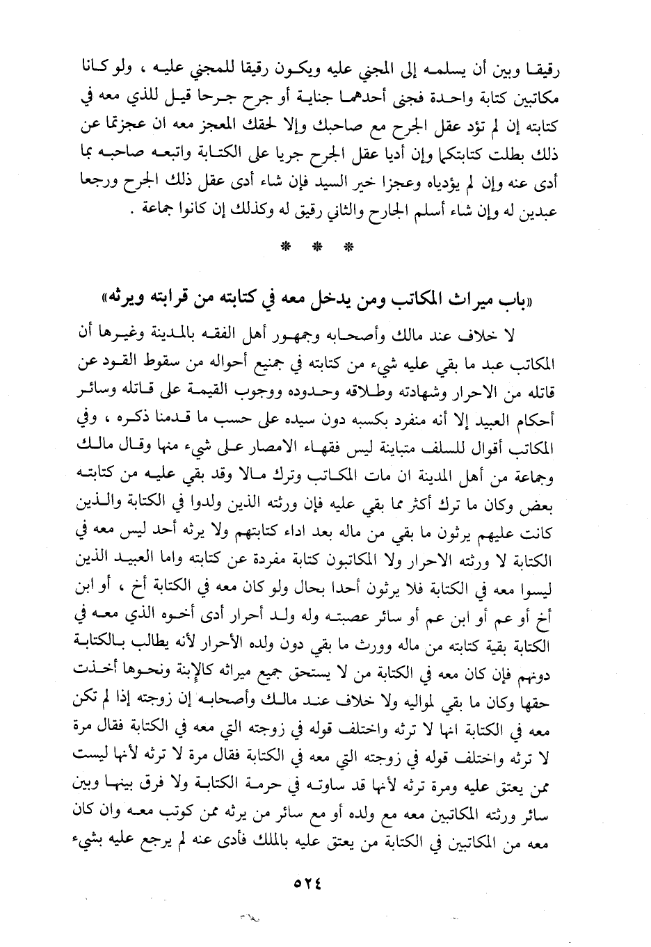 رقيقا وبين ان يسلمه الى المجني عليه ويكون رقيقا للمجني عليه ولو كانا مكاتبين كتابة واحده فجنى احدهما جناية او جرح جرحا قيل للذي معه في كتابته إن لم تؤد عقل الجرح مع صاحبك والا لحقك المعجز معه ان عجزتما عن ذلك بطلت كتابتكما وان أديا عقل الجرح جريا على الكتابه واتبعه صاحبه بما ادى عنه وان لم يؤدياه وعجزا خير السيد فإن شاء ادى عقل ذلك الجرح ورجعا عبدين له وإن شاء اسلم الجارح والثاني رقيق له وكذلك ان كانوا جماعه باب ميراث المكاتب ومن يدخل معه في كتابته من قرابته ويرثه لا خلاف عند مالك واصحابه وجمهور أهل الفقه بالمدينه وغيرها ان المكاتب عبد ما بقي عليه شيء من كتابته في جميع احواله من سقوط القود عن قاتله من الاحرار وشهادته وطلاقه وحدوده ووجوب القيمه على قاتله وسائر احكام العبيد الا انه منفرد بكسبه دون سيده على حسب ما قدمناه ذكره وفي المكاتب اقوال للسلف متباينه ليس فقهاء الامصار على شيء منها وقال مالك وجماعة من اهل المدينه ان مات المكاتب وترك مالا وقد بقي عليه من كتابته بعض وكان ما ترك اكثر مما بقي عليه فإن ورثته الذين ولدوا في الكتابه والذين كانت عليهم يرثون ما بقي من ماله بعد اداء كتابتهم ولا يرثه احد ليس معه في الكتابه لا ورثته الاحرار ولا المكاتبون كتابه مفرده عن كتابته واما العبيد الذين ليسوا معه في الكتابه فلا يرثون احد بحال ولو كان معه في الكتابه اخ او ابن اخ او عم او ابن عم او سائر عصبته وله ولد أحرار ادى اخوه الذي معه في الكتابه بقية كتابته من ماله وورث ما بقي دون ولده الاحرار لأنه يطالب بالكتابه دونهم فإن كان معه في الكتابه من لا يستحق جميع ميراثه كالابنه ونحوها اخذت حقها وكان ما بقي لمواليه ولا خلاف عند مالك واصحابه إن زوجته اذا لم تكن معه في الكتابه انها لاترثه واختلف قوله في زوجته التي معه في الكتابه فقال مره لاترثه واختلف قوله في زوجته التي معه في الكتابه فقال مرة لاترثه لانها ليست ممن يعتق عليه ومرة ترثه لانها قد ساوته في حرمة الكتابه ولا فرق بينها وبين سائر ورثته المكاتبين معه مع ولده او مع سائر من يرثه ممن كوتب معه وان كان معه من المكاتبين في الكتابه من يعتق عليه بالملك فأدى عنه لم يرجع عليه بشيء