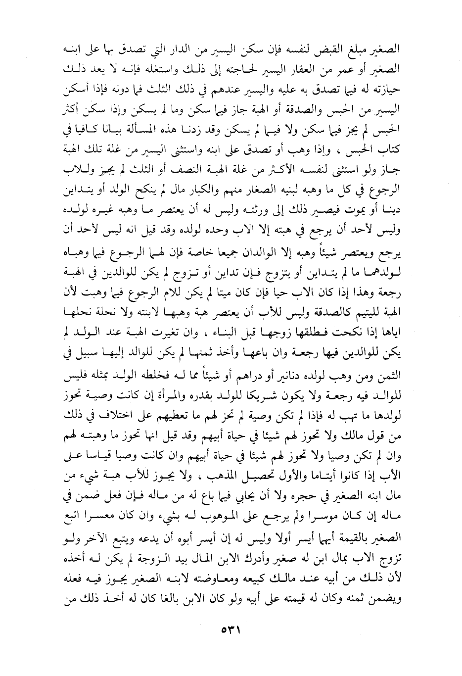 الصغير مبلغ القبض لنفسه فإن سكن اليسير من الدار التي تصدق بها على ابنه الصغير أو عمر من العقار اليسير لحاجته الى ذلك واستغله فإنه لايعد ذلك حيازته له فيما تصدق به عليه واليسير عندهم في ذلك الثلث فما دونه فإذا اسكن اليسير من الحبس والصدقه او الهبه جاز فيما سكن ومالم يسكن واذا سكن أكثر الحبس لم يجز فيما سكن ولا فيما لم يسكن وقد زدنا هذه المسأله بيانا كافيا في كتاب الحبس واذا وهب او تصدق على ابنه واستثنى اليسير من غلة تلك الهبة جاز ولو استثنى لنفسه الاكثر من غلة الهبه النصف او الثلث لم يجز وللأب الرجوع في كل ما وهبه لبنيه الصغار منهم والكبار مال لم ينكح الولد او يتداين دينا او يموت فيصير ذلك الى ورثته وليس له ان يعتصر ما وهبه غيره لولده وليس لأحد ان يرجع في هبته الا الاب وحده لولده وقد قيل انه ليس لاحد ان يرجع ويعتصر شيئا وهبه الا الوالدان جميعا خاصة فإن لهما الرجوع فيما وهباه لولدهما مالم يتداين او يتزوج فإن تداين او تزوج لم يكن للوالدين في الهبه رجعه وهذا اذا كان الاب حيا فإن كان ميتا لم يكن للام الرجوع فيما وهبت لان الهبة لليتيم كالصدقه وليس للاب ان يعتصر هبة وهبها لابنته ولا نحله نحلها اياها اذا نكحت فطلقها زوجها قبل البناء وان تغيرت الهبة عند الولد لم يكن للوالدين فيها رجعة وان باعها واخذ ثمنها لم يكن للوالد اليها سبيل في الثمن ومن وهب لولده دنانير او دراهم او شيئا مما له فخلطه الولد بمثله فليس للوالد فيه رجعة ولا يكون شريكا للولد بقدره والمرأه ان كانت وصيه تحوز لولدها ما تهب فإذا لم تكن وصيه لم تحز لهم ما تعطيهم على اخلاف في ذلك من قول مالك ولا تحوز لهم شيئا في حياة ابيهم وقد قيل انها تحوز ما وهبته لهم وان لم تكن وصيا ولا تحوز لهم شيئا فى حياة أبيهم وان كانت وصيا قياسا على الاب اذا كانوا ايتاما والاول تحصيل المذهب ولايجوز للاب هبة شيء من مال ابنه الصغير في حجرة ولا ان يحابي فيما باع له من مال فإن فعل ضمن في ماله ان كان موسرا ولم يرجع على الموهوب له بشيء وان كان معسرا اتبع الصغير بالقيمه ايهما أيسر اولا وليس له ان أيسر ابوه ان يدعه ويتبع الاخر ولو تزوج الاب بمال ابن له صغير وادرك الابن المال بيد الزوجه لم يكن له اخذه لان ذلك من ابيه عند مالك كبيعه ومعاوضته لابنه الصغير يجوز فيه فعله ويضمن ثمنه وكان له قيمته على ابيه ولو كان الابن بالغا كان له اخذ ذلك من