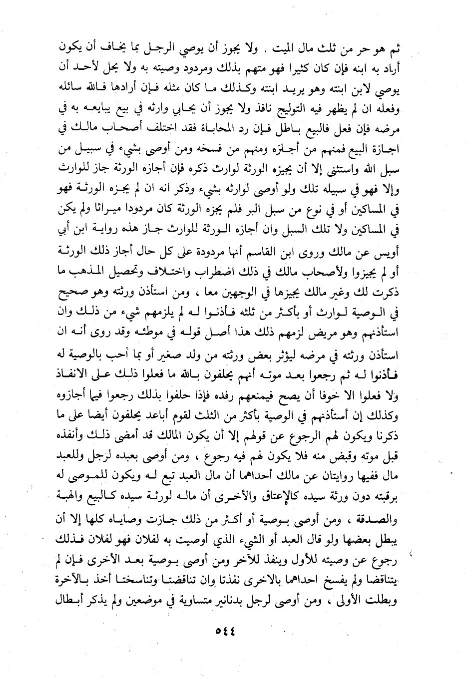 ثم هو حر من ثلث مال الميت ولا يجوز ان يوصي الرجل بما يخاف ان يكون أراد به ابنه فإن كان كثيرا فهو متهم بذلك ومردود وصيته به ولا يحل لاحد أن يوصي لابن بنته وهو يريد ابنته وكذلك ما كان مثله فإن ارادها فالله سائله وفعله ان لم يظهر فيه التوليج نافذ ولا يجوز ان يحابي وارثه في بيع يبيعه به في مرضه فإن فعل فالبيع باطل فإن رد المحاباه فقد اختلف أصحاب مالك في اجازة البيع فمنهم من اجازه ومنهم من فسخه ومن اوصى بشيء في سبيل من سبل الله واستثنى إلا ان يجيزه الورثة لوارث ذكره فإن اجازه الورثة جاز للوارث وإلا فهو في سبيله تلك ولو اوصى لوارثه بشيء وذكر انه ان لم يجزه الورثه فهو في المساكين او في نوع من سبل البر فلم يجزه الورثه كان مردودا ميراثا ولم يكن في المساكين ولا تلك السبل وأن أجازه الورثة للوارث جاز هذه رواية ابن ابي أويس عن مالك وروى ابن القاسم انها مردودة على كل حال أجاز ذلك الورثة او لم يجيزوا ولأصحاب مالك في ذلك اضطراب واختلاف وتحصيل المذهب ما ذكرت لك وغير مالك يجيزها في الوجهين معا ومن استأذن ورثته وهو صحيح في الوصيه لوارث أو بأكثر من ثلثه فأذنوا له لم يلزمهم شيء من ذلك وان استأذنهم وهو مريض لزمهم ذلك هذا اصل قوله في موطئه وقد روى أنه إن استأذن ورثته في مرضه ليؤثر بعض ورثته من ولد صغير أو بما أحب بالوصيه له فأذنوا له ثم رجعوا بعد موته أنهم يحلفون بالله ما فعلوا ذلك على الانفاذ ولا فعلوا الا خوفا أن يصح فيمنعهم رفده فإذا حلفوا بذلك رجعوا فيما أجازوه وكذلك إن استأذنهم في الوصيه بأكثر من الثلث لقوم أباعد يحلفون ايضا على ما ذكرنا ويكون لهم الرجوع عن قولهم إلا أن يكون المالك قد امضى ذلك وأنفذه قبل موته وقبض منه فلا يكون لهم فيه رجوع ومن اوصى بعبده لرجل وللعبد مال ففيها روايتان عن مالك أحدهما أن مال العبد تبع له ويكون للموصي له برقبته دون ورثة سيده كالاعتاق والاخرى أن ماله لورثة سيده كالبيع والهبه والصدقه ومن أوصى بوصية أو أكثر من ذلك جازت وصاياه كلها إلا ان يبطل بعضها ولو قال العبد أو الشيء الذي أوصيت به لفلان فهو لفلان فذلك رجوع عن وصيته للاول وينفذ للاخر ومن اوصى بوصية بعد الاخرى فإن لم يتناقضا ولم يفسخ احدهما بالاخرى نفذتا وان تناقضتا وتناسختا أخذ بالاخرى وبطلت الاولى ومن أوصى لرجل بدنانير متساويه في موضعين ولم يذكر أبطال