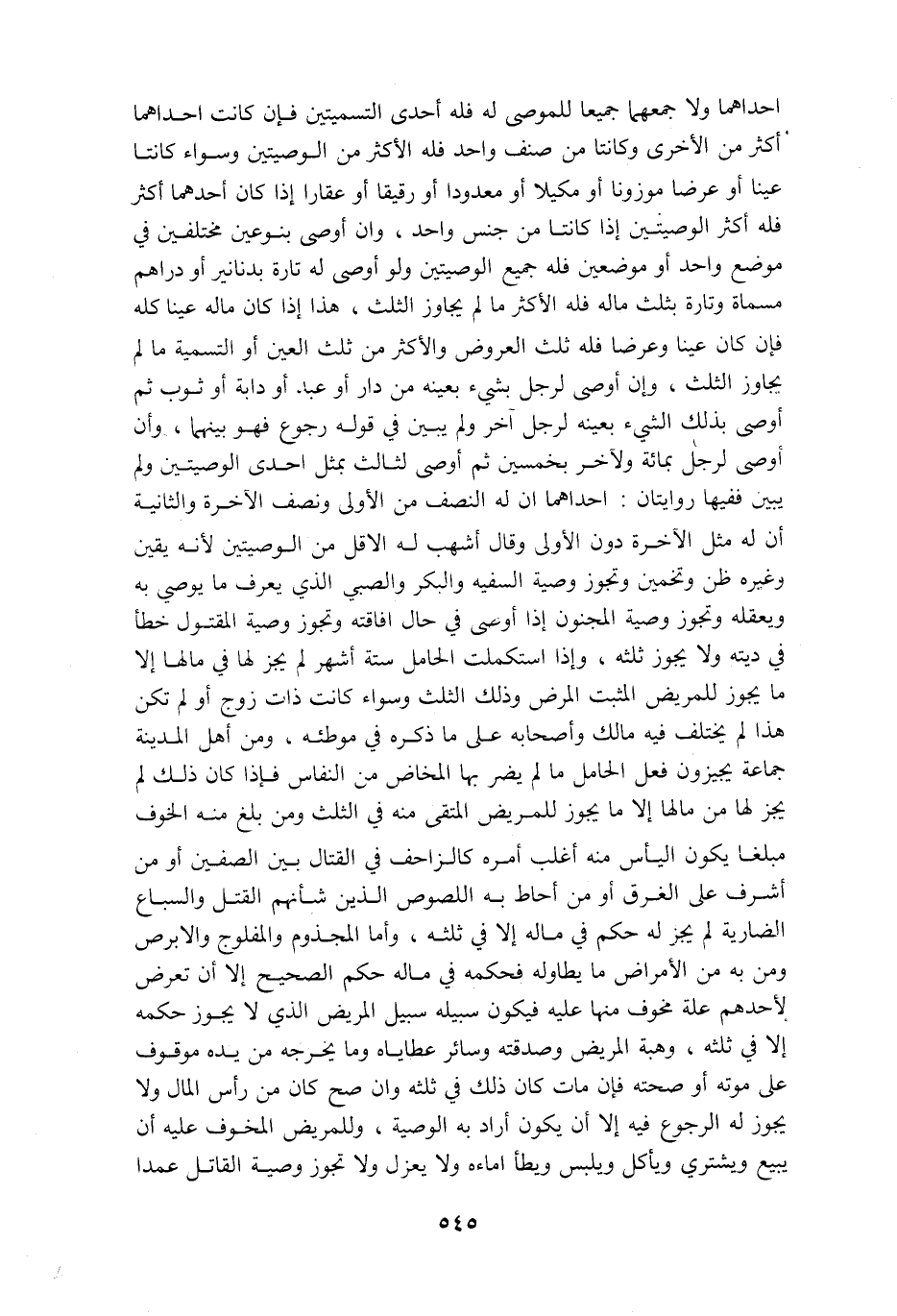 احدهما ولا جمعهما جميعا للموصي له فله احدى التسميتين فإن كانت احدهما اكثر من الاخرى وكانتا من صنف واحد فله الاكثر من الوصيتين وسواء كانتا عينا او عرضا موزونا او مكيلا او معدودا او رقيقا او عقارا اذا كان احدهما اكثر فله اكثر الوصيتين اذا كانتا من جنس واحد وان اوصى بنوعين مختلفين في موضع واحد او موضعين فله جميع الوصيتين ولو اوصى له تارة بدنانير او دراهم مسماه وتارة بثلث ماله فله الاكثر مالم يجاوز الثلث هذا اذا كان ماله عينا كله فإن كان عينا وعرضا فله ثلث العروض والاكثر من ثلث العين او التسميه مالم يجاوز الثلث وان أوصى لرجل بشيء بعينه من دار أو عبد أو دابة أو ثوب ثم أوصى بذلك الشيء بعينه لرجل آخر ولم يبين في قوله رجوع فهو بينهما وان أوصى لرجل بمائة ولاخر بخمسين ثم اوصى لثالث بمثل احدى الوصيتين ولم يبين ففيها روايتان احداهما ان له النصف من الاولى ونصف الاخرة والثانية أن له مثل الاخرة دون الاولى وقال أشهب له الاقل من الوصيتين لأنه يقين وغيره ظن وتخمين وتجوز وصية السفيه والبكر والصبي الذي يعرف ما يوصى به ويعقله وتجوز وصية المجنون اذا اوصى في حال افاقته وتجوز وصية المقتول خطأ في ديته ولا يجوز ثلثه وإذا استكملت الحامل ستة أشهر لم يجز لها في مالها إلا ما يجوز للمريض المثبت المرض وذلك الثلث وسواء كانت ذات زوج أو لم تكن هذا لم يختلف فيه مالك وأصحابه على ما ذكره في موطئه ومن أهل المدينه جماعة يجيزون فعل الحامل مالم يضر بها المخاض من النفاس فإذا كان ذلك لم يجز لها من مالها إلا ما يجوز للمريض المتقى منه في الثلث ومن بلغ منه الخوف مبلغا يكون اليأس منه أغلب أمره كالزاحف في القتال بين الصفين أو من أشرف على الغرق أو من أحاط به اللصوص الذين شأنهم القتل والسباع الضارية لم يجز له حكم في ماله الا في ثلثه وأما المجذوم والمفلوج والابرص ومن به من الامراض ما يطاوله فحكمه في ماله حكم الصحيح إلا ان تعرض لاحدهم علة مخوف منها عليه فيكون سبيله سبيل المريض الذي لا يجوز حكمه إلا في ثلثه وهبة المريض وصدقته وسائر عطاياه وما يخرجه من يده موقوف على موته أو صحته فإن مات كان ذلك في ثلثه وإن صح كان من رأس المال ولا يجوز له الرجوع فيه إلا أن يكون أراد به الوصيه وللمريض المخوف عليه أن يبيع ويشتري ويأكل ويلبس ويطأ اماءه ولا يعزل ولا تجوز وصية القاتل عمدا