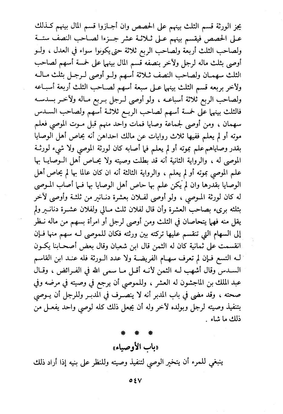 يجز الورثه قسم الثلث بينهم على الحصص وإن اجازوا قسم المال بينهم كذلك على الحصص فيقسم بينهم على ثلاثة عشر جزءا لصاحب النصف ستة ولصاحب الثلث اربعة ولصاحب الربع ثلاثة حتى يكونوا سواء في العدل ولو أوصى بثلث ماله لرجل ولآخر بنصفه قسم المال بينهم على خمسة اسهم لصاحب الثلث سهمان ولصاحب النصف ثلاثة اسهم ولو اوصى لرجل بثلث ماله ولاخر بربعه قسم الثلث بينهما على سبعه أسهم لصاحب الثلث أربعة أسباعه ولصاحب الربع ثلاثة أسباعه ولو أوصى لرجل بربع ماله ولآخر بسدسه فالثلث بينهما على خمسة اسهم لصاحب الربع ثلاثة اسهم ولصاحب السدس سهمان ومن اوصى لجماعة وصايا فمات واحد منهم قبل موت الموصي فعلم موته او لم يعلم ففيها ثلاث روايات عن مالك احداهن انه يحاص اهل الوصايا بقدر وصياهم علم بموته او لم يعلم فما اصابه كان لورثة الموصي ولا شيء لورثة الموصي له والروايه الثانيه أنه قد بطلت وصيته ولا يحاص أهل الوصايا بها علم الموصي بموته او لم يعلم والروايه الثالثه أنه كان إن عالما بها لم يحاص أهل الوصايا بقدرها وان لم يكن علم بها حاص أهل الوصايا بها فما أصاب الموصي له كان لورثة الموصي ولو اوصى لفلان بعشرة دنانير من ثلثه وأوصى لآخر بثلثه بريء بصاحب العشرة وأن قال لفلان ثلث مالي ولفلان عشرة دنانير ولم يقل منه فهما يتحاصان في الثلث ومن اوصى لرجل او امرأه بسهم من ماله نظر الى السهام التي تنقسم عليها تركته بين ورثته فكان للموصي له سهم منها فإن انقسمت على ثمانية كان له الثمن قال ابن شعبان وقال بعض اصحابنا يكون له التسع فإن لم تعرف سهام الفريضه ولا عدد الورثه فله عند ابن القاسم السدس وقال أشهب له الثمن لأنه أقل ما سمى الله في الفرائض وقال عبدالملك بن الماحشون له العشر وللموصي أن يرجع في وصيته في مرضه وفي صحته وقد مضى في باب المدبر أنه لاينصرف في المدبر وللرجل أن يوصي بتنفيذ وصيته لرجل وبولده لآخر وله أن يجعل ذلك كله لوصي واحد يفعل من ذلك ما شاء باب الاوصياء ينبغي للمرء ان يتخير الوصي لتنفيذ وصيته والنظر على بنيه اذا اراد ذلك