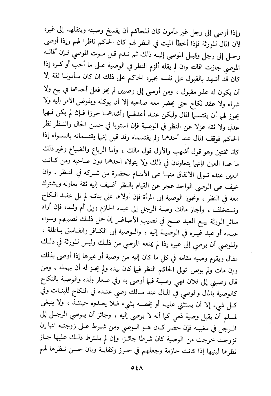 واذا اوصى الى رجل غير مأمون كان للحاكم أن يفسخ وصيته وينقلها الى غيره لان المال للورثه فإذا اخطأ الميث في النظر لهم كان الحاكم ناظرا لهم واذا اوصى رجل الى رجل وقبل الموصي اليه ذلك ثم ندم قبل موت الموصي فإن اقاله الموصي جازت اقالته وان لم يقله ألزم النظر في الوصيه على ما احب أو كره إذا كان قد اشهد بالقبول على نفسه يجبره الحاكم على ذلك ان كان مأمونا ثقة الا ان يكون له عذر مقبول ومن أوصى الى وصيين لم يجز فعل احدهما في بيع ولا شراء ولا عقد نكاح حتى يحضر معه صاحبه الا ان يوكله ويفوض الامر اليه ولا يجوز لهما ان يقتسما المال وليكن عند اعدلهما واشدهما حرزا فإن لم يكن فيهما عدل ولا ثقه عزلا عن النظر في الوصيه فإن استويا في حسن الحال والنظر نظر الحاكم فوقف المال عند احدهما ولم يقتسماه وقد قيل انهما يقتسمانه بالسواء اذا كانا ثقتين وهو قول اشهب والاول قول مالك وأما الرباع والضياع وغير ذلك ما عدا العين فانهما يتعاونان في ذلك ولا يتولاه احدهما دون صاحبه ومن كانت العين عنده تولى الانفاق منها على الايتام بحضرة من شركه في النظر وان خيف على الوصي الواحد عجز عن القيام بالنظر اضيف اليه ثقة يعاونه ويشترك معه في النظر تجوز الوصية الى المرأة فإن اولاها على بناته لم تل عقد النكاح وتستحلف واجاز مالك وصية الرجل الى عبده الحازم والى أم ولده فإن أراد سائر الورثه بيع العبد صح في نصيب الاصاغر إن حمل ذلك نصيبهم وسواء عبده او عبد غيره في الوصيه اليه والوصيه الى الكافر والفاسق باطله وللوصي ان يوصي الى غيره اذا لم يمنعه الموصي من ذلك وليس للورثه في ذلك مقال ويقوم وصية مقامه في كل ما كان اليه من وصيه او غيرها اذا اوصى بذلك وان مات ولم يوصي تولى الحاكم النظر فيما كان بيده ولم يجز له أن يهمله ومن قال وصيتي إلى فلان فهي وصية فيما أوصى به وفي صغار ولده والوصية بالنكاح كالوصية بالمال والوصي في المال عند مالك وصي عنده في النكاح للبنات وفي كل شيء إلا أن يستثني عليه أو يخصه بشيء فلا يعدوه حينئذ ولا ينبغي لمسلم أن يقبل وصية ذمي كما أنه لا يوصي إليه وجائز أن يوصي الرجل إلى الرجل في مغيبه فإن حضر كان هو الوصي ومن شرط على زوجته انها إن تزوجت خرجت من الوصية كان شرطا جائزا وإن لم يشترط ذلك عليها جاز نظرها لبنيها إذا كانت حازمة وجعلهم في حرز وكفاية وبان حسن نظرها لهم