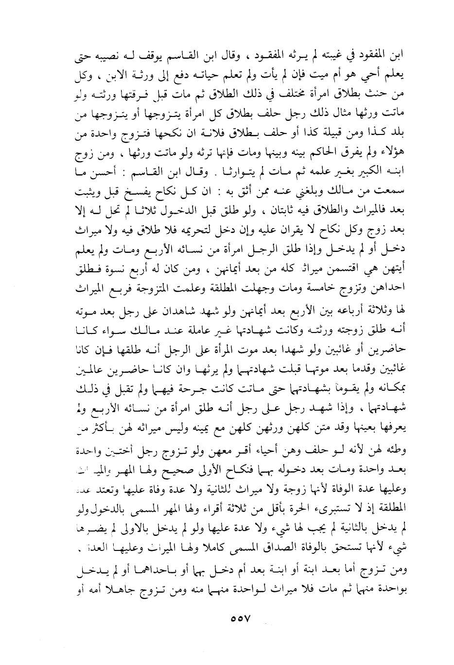 ابن المفقود في غيبته لم يرثه المفقود وقال ابن القاسم يوقف له نصيبه حتى يعلم أحي هو أم ميت فإن لم يأت ولم تعلم حياته دفع الى ورثة الابن وكل من حنث بطلاق امرأة مختلف في ذلك الطلاق ثم مات قبل فرقتها ورثته ولو ماتت ورثها مثال ذلك رجل حلف بطلاق كل امرأة يتزوجها أو يتزوجها من بلد كذا ومن قبيلة كذا أو حلف بطلاق فلانة ان نكحها فتزوج واحدة من هؤلاء ولم يفرق الحاكم بينه وبينها ومات فإنها ترثه ولو ماتت ورثها ومن زوج ابنه الكبير بغير علمه ثم مات لم يتوارثا وقال ابن القاسم أحسن ما سمعت من مالك وبلغني عنه ممن أثق به ان كل نكاح يفسخ قبل ويثبت بعد فالميراث والطلاق فيه ثابتان ولو طلق قبل الدخول ثلاثا لم تحل له إلا بعد زوج وكل نكاح لا يقران عليه وإن دخل لتحريمه فلا طلاق فيه ولا ميراث دخل أو لم يدخل وإذا طلق الرجل امرأة من نسائه الأربع ومات ولم يعلم أيتهن هي اقتسمن ميراثه كله من بعد أيمانهن ومن كان له أربع نسوة فطلق أحداهن وتزوج خامسة ومات وجهلت المطلقة وعلمت المتزوجة فربع الميراث لها وثلاثة أرباعه بين الأربع بعد أيمانهن ولو شهد شاهدان على رجل بعد موته أنه طلق زوجته ورثته وكانت شهادتها غير عاملة عند مالك سواء كانا حاضرين او غائبين ولو شهدا بعد موت المرأة على الرجل أنه طلقها فإن كانا غائبين وقدما بعد موتها قبلت شهادتهما ولم يرثها وان كانا حاضرين عالمين بمكانه ولم يقوما بشهادتهما حتى ماتت كانت جرحة فيهما ولم تقبل في ذلك شهادتهما وإذا شهد رجل على رجل أنه طلق امرأة من نسائه الأربع ولم يعرفها بعينها وقد متن كلهن ورثهن كلهن مع يمينه وليس ميراثه لهن بأكثر من وطئه لهن لأنه لو حلف وهن أحياء أقر معهن ولو تزوج رجل اختين واحدة بعد واحدة ومات بعد دخوله بهما فنكاح الأولى صحيح ولها المهر والميراث وعليها عدة الوفاء لأنها زوجة ولا ميراث للثانية ولا عدة وفاة عليها وتعتد عدة المطلقة إذ لا تستبرىء الحرة بأقل من ثلاثة أقراء ولها المهر المسمى بالدخول ولو لم يدخل بالثانية لم يجب لها شيء ولا عدة عليها ولو لم يدخل بالأولى لم يضرها شيء لأنها تستحق بالوفاة الصداق المسمى كاملا ولها الميراث وعليها العدة ومن تزوج أما بعد ابنة أو ابنة بعد أن دخل بهما أو باحداهما أو لم يدخل بواحدة منهما ثم مات فلا ميراث لواحدة منهما منه ومن تزوج جاهلا أمه او