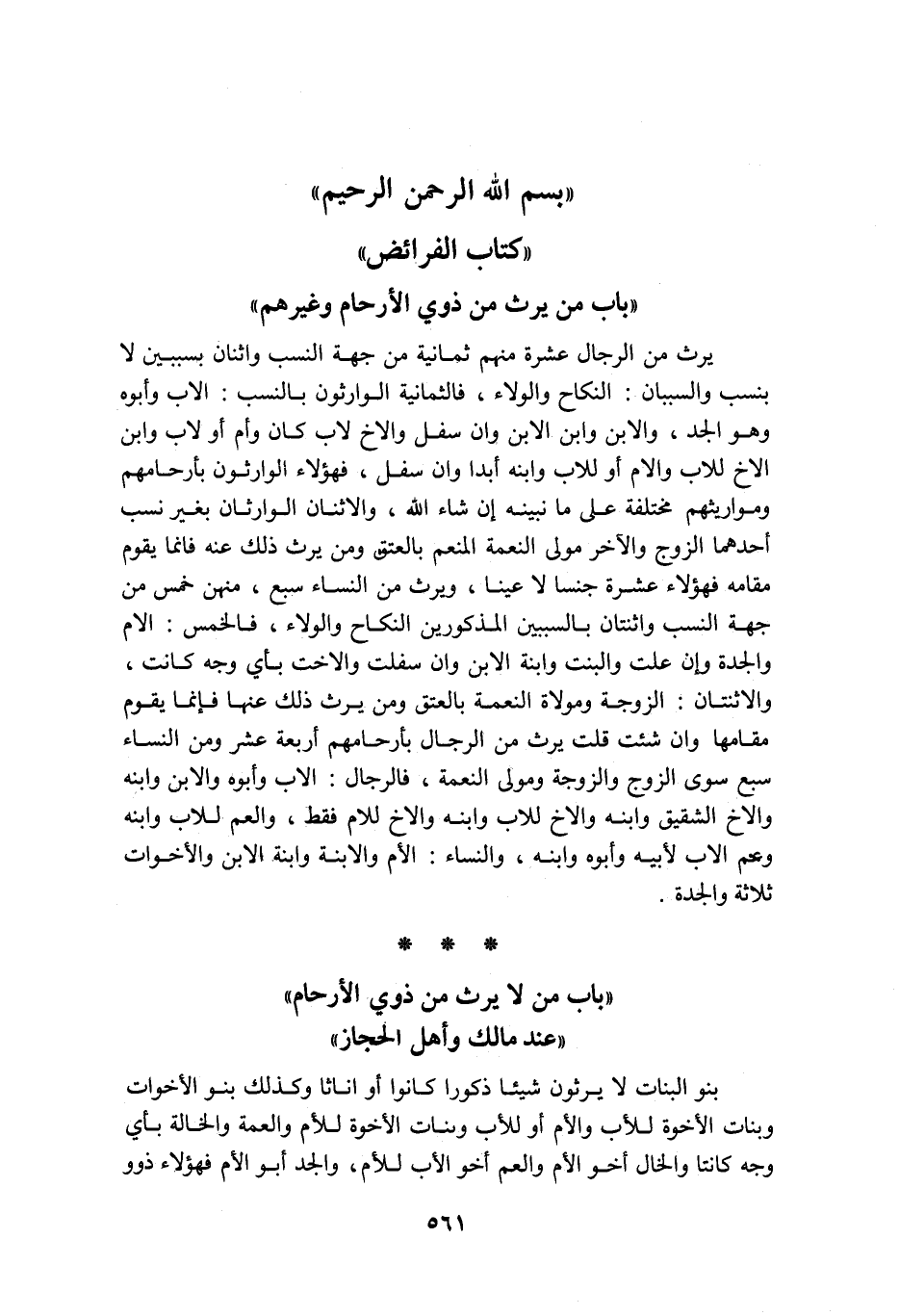بسم الله الرحمن الرحيم كتاب الفرائض باب من يرث من ذوي الأرحام وغيرهم يرث من الرجال عشرة منهم ثمانية من جهة النسب واثنان بسببين لا بنسب والسببان النكاح والولاء فالثمانية الوارثون بالنسب الاب وأبوه وهو الجد والابن وابن الابن وان سفل والاخ لاب كان وأم أو لاب وابن الاخ للاب والأم أو للأب والاب وابنه أبدا وان سفل فهؤلاء الوارثون بأرحامهم ومواريثهم مختلفة على ما نبينه إن شاء الله والاثنان الوارثان بغير نسب أحدهما الزوج والآخر مولى النعمة المنعم بالعتق ومن يرث ذلك عنه فانما يقوم مقامه فهؤلاء عشرة جنسا لا عينا ويرث من النساء سبع منهن خمس من جهة النسب وإثنتان بالسببين المذكورين النكاح والولاء فالخمس الأم والجدة وإن علت والبنت وابنة الابن وان سفلت والاخت بأي وجه كانت والاثنتان الزوجة ومولاة النعمة بالعتق ومن يرث ذلك عنها فإنما يقوم مقامها وإن شئت قلت يرث من الرجال بأرحامهم أربعة عشر ومن النساء سبع سوى الزوج والزوجة ومولى النعمة فالرجال الاب وأبوه والابن وابنه والاخ الشقيق وابنه والاخ للاب وابنه والاخ للام فقط والعم للاب وابنه وعم الاب لأبيه وأبوه وابنه والنساء الأم والأبنة وابنة الابن والأخوات ثلاثة والجدة باب من لا يرث من ذوي الأرحام عند مالك وأهل الحجاز بنو البنات لا يرثون شيئا ذكورا كانوا أو إناثا وكذلك بنو الأخوات وبنات الأخوة للأب والأم أو للأب وبنات الأخوة للأم والعمة والخالة بأي وجه كانتا والخال أخو الأم والعم أخو الأب للأم والجد أبو الأم فهؤلاء ذوو