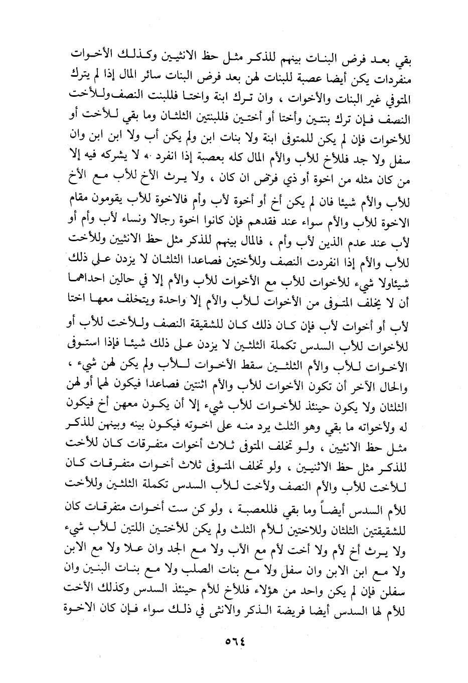 بقي بعد فرض البنات بينهم للذكر مثل حظ الانثيين وكذلك الأخوات منفردات يكن أيضا عصبة للبنات لهن بعد فرض البنات سائر المال إذا لم يترك المتوفي غير البنات والاخوات وإن ترك ابنة واختا فللبنت النصف وللأخت النصف فإن ترك بنتين وأختا أو أختين فللبنتين الثلثان وما بقي للأخت أو للأخوات فإن لم يكن للمتوفى ابنة ولا بنات ابن ولم يكن أب ولا ابن ابن وأن سفل ولا جد فللأخ للأب والأم المال كله بعصبة إذا انفرد به لا يشركه فيه إلا من كان مثله من اخوة أو ذي فرض ان كان ولا يرث الأخ للأب مع الأخ للأب والأم شيئا فان لم يكن أخ أو أخوة لأب وأم فالأخوة للأب يقومون مقام الاخوة للأب والام سواء عند فقدهم فإن كانوا اخوة رجالا ونساء لأب وأم أو لأب عند عدم الذين لأب وأم فالمال بينهم للذكر مثل حظ الأنثيين وللأخت للأب والأم إذا انفردت النصف وللأختين فصاعدا الثلثان لا يزدن على ذلك شيئا ولا شيء للأخوات للأب مع الأخوات للأب والأم إلا فى حالين احداهما أن لا يخلف المتوفي من الأخوات للأب والأم إلا واحدة ويتخلف معها أختا لأب أو أخوات لأب فإن كان ذلك كان للشقيقة النصف وللأخت للأب أو للأخوات للأب السدس تكملة الثلثين لا يزدن على ذلك شيئا فإذا استوفى الأخوات للأب والأم الثلثين سقط الأخوات للأب ولم يكن لهن شيء والحال الآخر أن تكون الأخوات للاب والأم اثنتين فصاعدا فيكون لهما أو لهن الثلثان ولا يكون حينئذ للأخوات للأب شيء إلا أن يكون معهن أخ فيكون له ولأخواته ما بقي وهو الثلث يرد منه على اخوته فيكون بينه وبينهن للذكر مثل حظ الأنثيين ولو تخلف المتوفى ثلاث أخوات متفرقات كان للأخت للذكر مثل حظ الأنثيين ولو تخلف المتوفى ثلاث أخوات متفرقات كان للأخت للأب والأم النصف ولأخت للأب السدس تكملة الثلثين وللأخت للأم السدس أيضا وما بقي فللعصبة ولو كن ست أخوات متفرقات كان للشقيقتين الثلثان وللاختين للأم الثلث ولم يكن للأختين اللتين للأب شيء ولا يرث أخ لأم ولا أخت لأم مع الأب ولا مع الجد وإن علا ولا مع الابن ولا مع ابن الابن وان سفل ولا مع بنات الصلب ولا مع بنات البنين وان سفلن فان لم يكن واحد من هؤلاء فللأخ للأم حينئذ السدس وكذلك الأخت للأم لها السدس ايضا فريضة الذكر والانثى فى ذلك سواء فان كان الأخوة