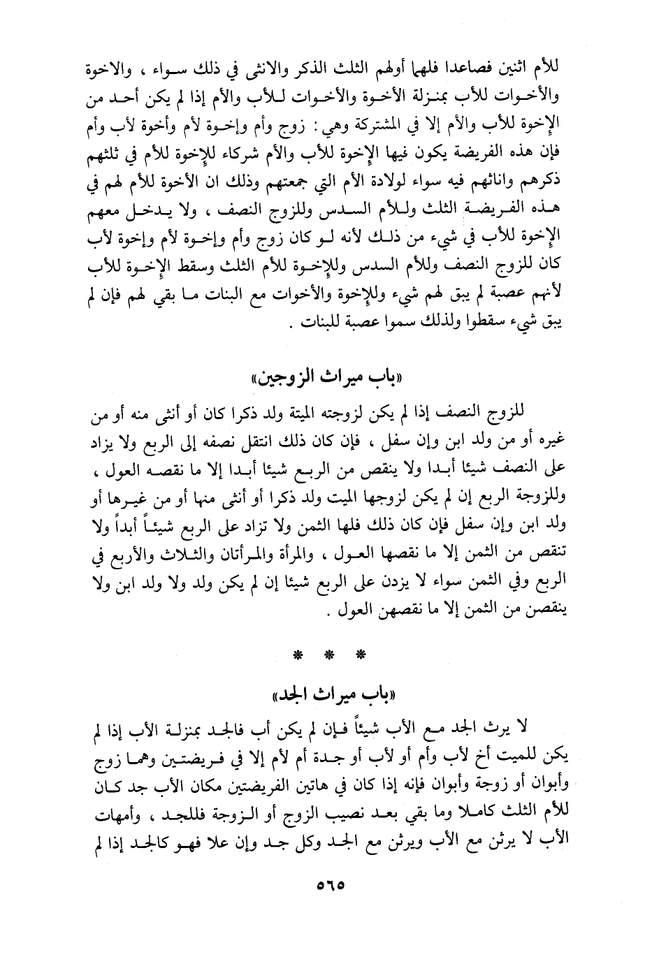 للأم اثنين فصاعدا فلهما أولهم الثلث الذكر والأنثى في ذلك سواء والاخوة والأخوات للأب بمنزلة الأخوة والأخوات للأب والأم إذا لم يكن أحد من الإخوة للاب والأم إلا في المشتركة وهي زوج وأم وإخوة لأم وأخوة لأب وأم فإن هذه الفريضة يكون فيها الإخوة للأب والأم شركاء للإخوة للأم في ثلثهم ذكرهم وأناثهم فيه سواء لولادة الأم التي جمعتهم وذلك أن الأخوة للأم لهم في هذه الفريضة الثلث وللأم السدس وللزوج النصف ولا يدخل معهم الإخوة للأب في شيء من ذلك لأنه لو كان زوج وأم وإخوة لأم وإخوة لأب كان للزوج النصف وللأم السدس وللإخوة للأم الثلث وسقط الإخوة للاب لأنهم عصبة لم يبق لهم شيء وللإخوة والأخوات مع البنات ما بقي لهم فإن لم يبق شيء سقطوا ولذلك سموا عصبة للبنات باب ميراث الزوجين للزوج النصف إذا لم يكن لزوجته الميتة ولد ذكر كان أو أنثى منه أومن غيره أو من ولد ابن وإن سفل فإن كان ذلك انتقل نصفه الى الربع ولا يزاد على النصف شيئا أبدا ولا ينقص من الربع شيئا أبدا إلا ما نقصه العول وللزوجة الربع إن لم يكن لزوجها الميت ولد ذكر أو أنثى منها أو من غيرها أو ولد ابن وإن سفل فإن كان ذلك فلها الثمن ولا تزاد على الربع شيئا أبدا ولا تنقص من الثمن إلا ما نقصها العول والمرأة والمرأتان والثلاث والأربع في الربع وفي الثمن سواء لا يزدن على الربع شيئا إن لم يكن ولد ولا ولد ابن ولا ينقصن من الثمن إلا ما نقصهن العول باب ميراث الجد لا يرث الجد مع الاب شيئا فإن لم يكن اب فالجد بمنزلة الأب إذا لم يكن للميت أخ لأب وأم أو لأب أو جدة أم لأم إلا في فريضتين وهما زوج وأبوان أو زوجة وأبوان فإنه إذا كان في هاتين الفريضتين مكان الأب جد كان للأم الثلث كاملا وما بقي بعد نصيب الزوج أو الزوجة فللجد وأمهات الأب لا يرثن مع الأب ويرثن مع الجد وكل جد وإن علا فهو كالجد إذا لم