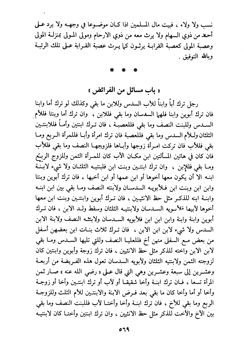 نسب ولا ولاء فبيت مال المسلمين إذا كان موضوعا في وجهه ولا يرد على احد من ذوي السهام ولا يرث معه من ذوي الارحام ومولى المولى بمنزلة المولى وعصبة المولى كعصبة القرابة يرثون كما يرث عصبة القرابة على تلك الرتبة وبالله التوفيق باب مسائل من الفرائض رجل ترك أبا وابنا للأب السدس وللابن ما بقي وكذلك لو ترك أما وابنا فإن ترك أبوين وابن فلهما السدسان وما بقي فللابن وإن ترك أما وبنتا فللأم السدس وللبنت النصف وما بقي فللعصبة فإن ترك ابنتين وأما فللابنتين الثلثان وللأم السدس وما بقي فللعصبة فإن ترك امرأة وأبا فللمرأة الربع وما بقي فللأب فإن تركت امرأة زوجها وأباها فلزوجها النصف وما بقي فللأب فان كان في هاتين المسألتين ابن مكان الأب كان للمرأة الثمن وللزوج الربع وما بقي فللإبن وان ترك ابنتين وبنت ابن فلبنتيه الثلثان ولا شيء لابنة ابنه الا أن يكون معها أخوها أو ابن عمها أو ابن أخيها فان ترك أبوين وبنتا وابن ابن وبنت ابن فالأبوين السدسان ولانته النصف وما بقى بين ابن ابنه وابنة ابنه للذكر مثل حظ الانثيين فان ترك أبوين وابنتين وبنت ابن معها اخوها لأبيها فلأبويه السدسان ولابنتيه الثلثان وسقط ولد الابن فان ترك ابوين وابنة وابنة وابن ابن ابن فلأبويه السدسان ولابنته النصف ولابنة الابن السدس ولا شيء لابن ابن الابن فان ترك ثلاث بنات ابن بعضهن أسفل من بعض مع السفلى منهن أخ فللعليا النصف وللتي تليها السدس وما بقي لابن الابن واخته للذكر مثل حظ الانثيين فان ترك زوجة وأبوين وابنتين كان لزوجته الثمن ولابنتيه الثلثان ولأبويه السدسان تعول هذه الفريضة من أربعة وعشرين الى سبعة وعشرين وهي التي قال علي رضي الله عنه صار ثمن المرأة تسعا فان ترك ابنة وأخا شقيقا أو لأب أو ترك ابنتين وأخا أو زوجته وأخا أو أما وأخا كان ما بقي بعد فرض الابنة والابنتين للأم الثلث وللزوجة الربع وما بقي للأخ فان ترك ابنة واخا واختا لأب فللبنت النصف وما بقي بين الأخ والأخت للذكر مثل حظ الانثيين وان ترك ابنتين واختا كان لابنتيه