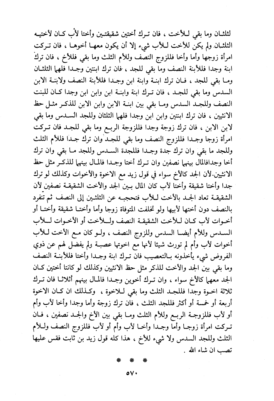 لثلثان وما بقي للأخت فان ترك أختين شقيقتين وأختا لأب كان لأختيه الثلثان ولم يكن للأخت للأب شيء إلا أن يكون معها أخوها فان تركت امرأة زوجها وأما واخا فللزوج النصف وللأم الثلث وما بقي فللأخ فان ترك ابنة وجدا فللابنة النصف وما بقي للجد فان ترك ابنتين وجدا فلهما الثلثان وما بقي للجد فان ترك ابنة وابنه ابن وجدا فللابنة النصف ولابنة الابن السدس وما بقي للجد فان ترك ابنة وابنة ابن وابن ابن وجدا كان للبنت النصف وللجد السدس وما بقي بين ابنة الابن وابن الابن للذكر مثل حظ الانثيين فان ترك ابنتين وابن ابن وجدا فلهما الثلثان وللجد السدس وما بقي لابن الأبن فان ترك زوجة وجدا فللزوجة الربع وما بقي للجد فان تركت امرأة زوجا وجدا فللزوج النصف وما بقي للجد وان ترك جدا فللأم الثلث وللجد ما بقي وان ترك جدة وجدا فللجدة السدس وللجد ما بقي وان ترك اخا وجدا فالمال بينهما نصفين وإن ترك أختا وجدا فالمال بينهما للذكر مثل حظ الانثيين لأن الجد كالأخ سواء في قول زيد مع الاخوة والأخوات وكذلك لو ترك جدا وأختا شقيقة وأختا لأب كان المال بين الجد والأخت الشقيقة نصفين لأن الشقيقة تعاد الجد بالأخت للأب فتحجبه عن الثلثين الى النصف ثم تنفرد بالنصف دون أختها لأبيها ولو تخلفت المتوفاة زوجا وأما وأختا شقيقة وأختا أو أخوات لأب كان للأخت الشقيقة النصف وللأخت أو الأخوات للأب السدس وللأم أيضا السدس وللزوج النصف ولو كان مع الأخت للأب أخوات لأب وأم لم تورث شيئا لأنها مع اخوتها عصبة ولم يفضل لهم عن ذوي الفروض شيء يأخذونه بالتعصيب فان ترك ابنة وجدا وأختا فللأبنة النصف وما بقي بين الجد والأخت للذكر مثل حظ الأنثيين وكذلك لو كانتا أختين كان الجد معهما كالأخ سواء وإن ترك أخوين وجدا فالمال بينهم أثلاثا فان ترك ثلاثة أخوة وجدا فللجد الثلث وما بقي للأخوة وكذلك ان كان الاخوة أربعة أو خمسة أو أكثر فللجد الثلث فان ترك زوجة وأما وجدا وأخا لأب وأم أو لأب فللزوجة الربع وللأم الثلث وما بقي بين الأخ والجد نصفين فان تركت امرأة زوجا وأما وجدا وأخا لأب وأم أو لأب فللزوج النصف وللأم الثلث وللجد السدس ولا شيء للأخ هذا كله قول زيد بن ثابت فقس عليها تصب ان شاء الله