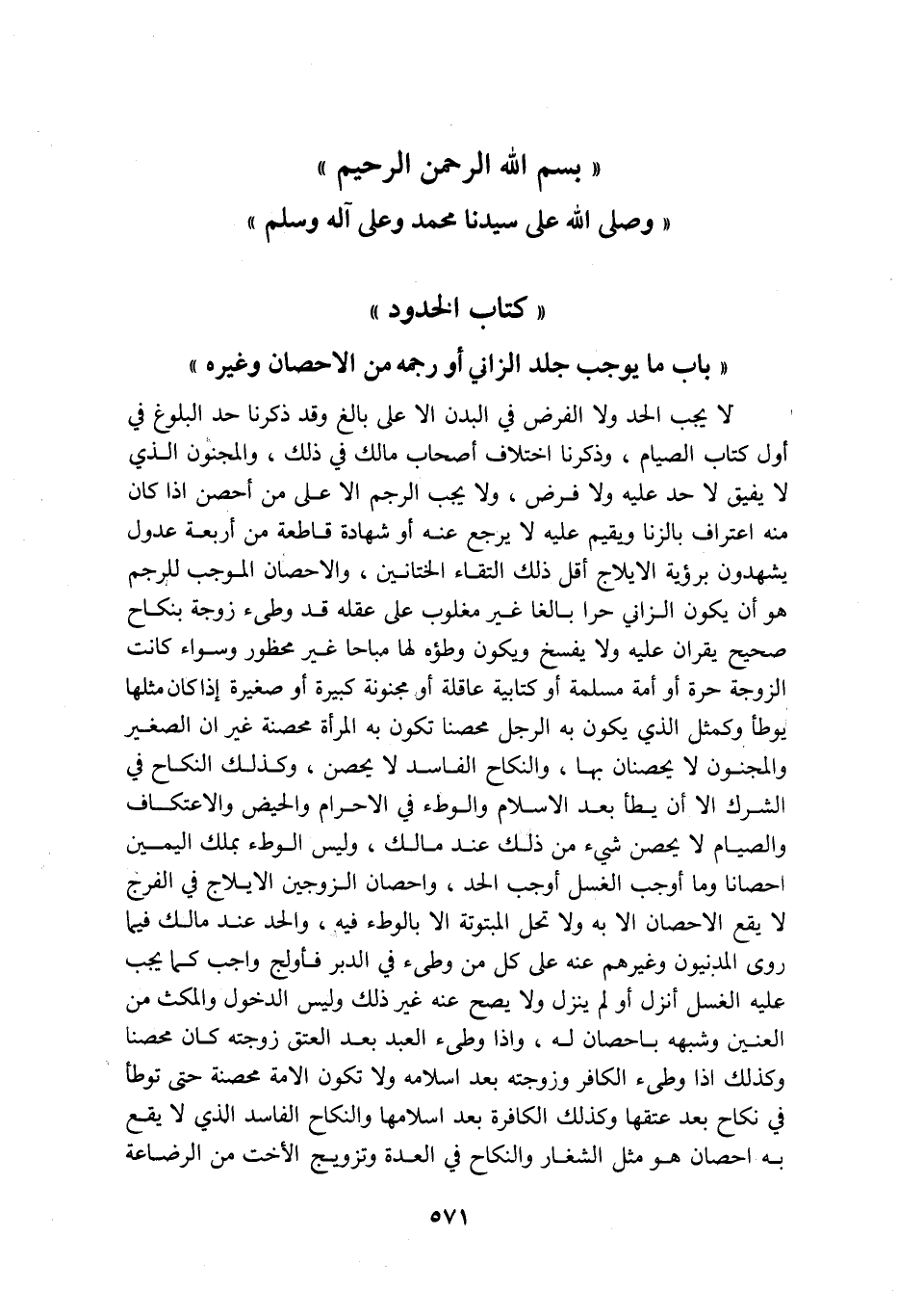 بسم الله الرحمن الرحيم وصلى الله على سيدنا محمد وعلى آله وسلم كتاب الحدود باب ما يوجب جلد الزاني أو رجمه من الاحصان وغيره لا يجب الحد ولا الفرض في البدن الا على بالغ وقد ذكرنا حد البلوغ في أول كتاب الصيام وذكرنا اختلاف أصحاب مالك في ذلك والمجنون الذي لا يفيق لا حد عليه ولا فرض ولا يجب الرجم الا على من أحصن اذا كان منه اعتراف الزنا ويقيم عليه لا يرجع عنه أو شهادة قاطعة من أربعة عدول يشهدون برؤية الايلاج أقل ذلك التقاء الختانين والاحصان الموجب للرجم هو أن يكون الزاني حرا بالغا غير مغلوب على عقله قد وطىء زوجة بنكاح صحيح يقران عليه ولا يفسخ ويكون وطؤه لها مباحا غير محظور وسواء كانت الزوجة حرة أو أمة مسلمة أو كتابية عاقلة أو مجنونة كبيرة أو صغيرة إذا كان مثلها يوطأ وكمثل الذي يكون به الرجل محصنا تكون به المرأة محصنة غير أن الصغير والمجنون لا يحصنان بها والنكاح الفاسد لا يحصن وكذلك النكاح في الشرك إلا أن يطأ بعد الاسلام والوطء في الاحرام والحيض والاعتكاف والصيام لا يحصن شيء من ذلك عند مالك وليس الوطء بملك اليمين احصانا وما أوجب الغسل أوجب الحد واحصان الزوجين الايلاج في الفرج لا يقع الاحصان الا به ولا تحل المبتوتة الا بالوطء فيه والحد عند مالك فيما روى المدنيون وغيرهم عنه على كل من وطىء في الدبر فأولج واجب كما يجب عليه الغسل أنزل أو لم ينزل ولا يصح عنه غير ذلك وليس الدخول والمكث من العنين وشبهه باحصان له وإذا وطىء العبد بعد العتق زوجته كان محصنا وكذلك اذا وطىء الكافر وزوجته بعد اسلامه ولا تكون الامة محصنة حتى توطأ في نكاح بعد عتقها وكذلك الكافرة بعد اسلامها والنكاح الفاسد الذي لا يقع به احصان هو مثل الشغار والنكاح في العدة وتزويج الأخت من الرضاعة