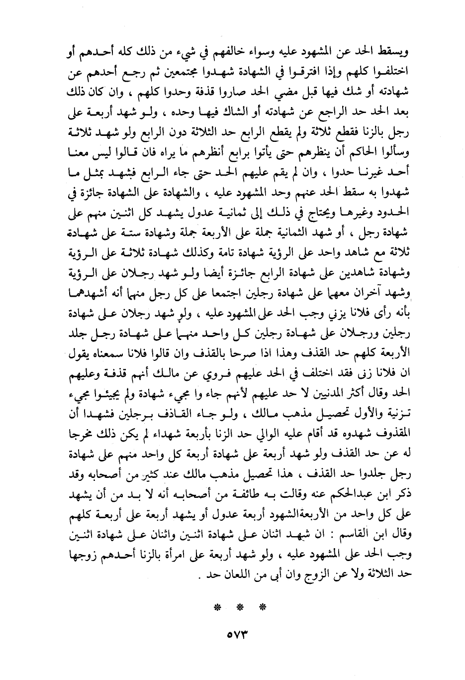 ويسقط الحد عن المشهود عليه وسواء خالفهم في شيء من ذلك كله أحدهم أو اختلفوا كلهم وإذا افترقوا في الشهادة شهدوا مجتمعين ثم رجع أحدهم عن شهادته أو شك فيها قبل مضي الحد صاروا قذفة وحدوا كلهم وان كان ذلك بعد الحد حد الراجع عن شهادته او الشاك فيها وحده ولو شهد أربعة على رجل بالزنا فقطع ثلاثة ولم يقطع الرابع حد الثلاثة دون الرابع ولو شهد ثلاثة وسألوا الحاكم أن ينظرهم حتى يأتوا برابع أنظرهم ما يراه فان قالوا ليس معنا أحد غيرنا حدوا وأن لم يقم عليهم الحد حتى جاء الرابع فيشهد بمثل ما شهدوا به سقط الحد عنهم وحد المشهود عليه والشهادة على الشهادة جائزة في الحدود وغيرها ويحتاج في ذلك الى ثمانية عدول يشهد كل اثنين منهم على شهادة رجل أو شهد الثمانية جملة على الاربعة جملة وشهادة ستة على شهادة ثلاثة مع شاهد واحد على الرؤية شهادة تامة وكذلك شهادة ثلاثة على الرؤية وشهادة شاهدين على شهادة الرابع جائزة أيضا ولو شهد رجلان على الرؤية وشهد آخران معهما على شهادة رجلين اجتمعا على كل رجل منهما أنه أشهدهما بأنه رأى فلانا يزني وجب الحد على المشهود عليه ولو شهد رجلان على شهادة رجلين ورجلان على شهادة رجلين كل واحد منهما على شهادة رجل جلد الأربعة كلهم حد القذف وهذا إذا صرحا بالقذف وان قالوا فلانا سمعناه يقول ان فلانا زنى فقد اختلف في الحد عليهم فروي عن مالك أنهم قذفة وعليهم الحد وقال أكثر المدنيين لا حد عليهم لأنهم جاءوا مجيء شهادة ولم يجيئوا مجيء تزنية والأول تحصيل مذهب مالك ولو جاء القاذف برجلين فشهدا أن المقذوف شهوده قد أقام عليه الوالي حد الزنا بأربعة شهداء لم يكن ذلك مخرجا له عن حد القذف ولو شهد أربعة على شهادة أربعة كل واحد منهم على شهادة رجل جلدوا حد القذف هذا تحصيل مذهب مالك عند كثير من أصحابه وقد ذكر ابن عبدالحكم عنه وقالت به طائفة من أصحابه أنه لا بد من أن يشهد على كل واحد من الأربعة الشهود أربعة عدول أو يشهد أربعة على أربعة كلهم وقال ابن القاسم أن شهد اثنان على شهادة اثنين واثنان على شهادة اثنين وجب الحد على المشهود عليه ولو شهد أربعة على امرأة بالزنا أحدهم زوجها حد الثلاثة ولاعن الزوج وإن أبى من اللعان حد
